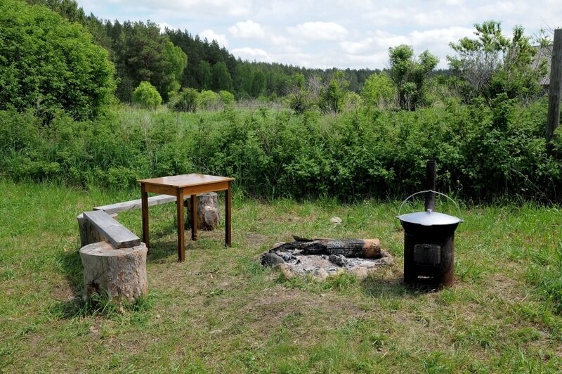 Рядом оборудовано костровище со скамейками и столиком для продуктов и напитков. Есть мангал и печь для приготовления плова, шурпы, ухи и т. д. на открытом огне.