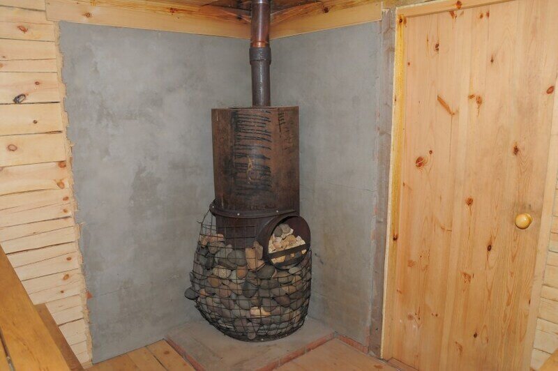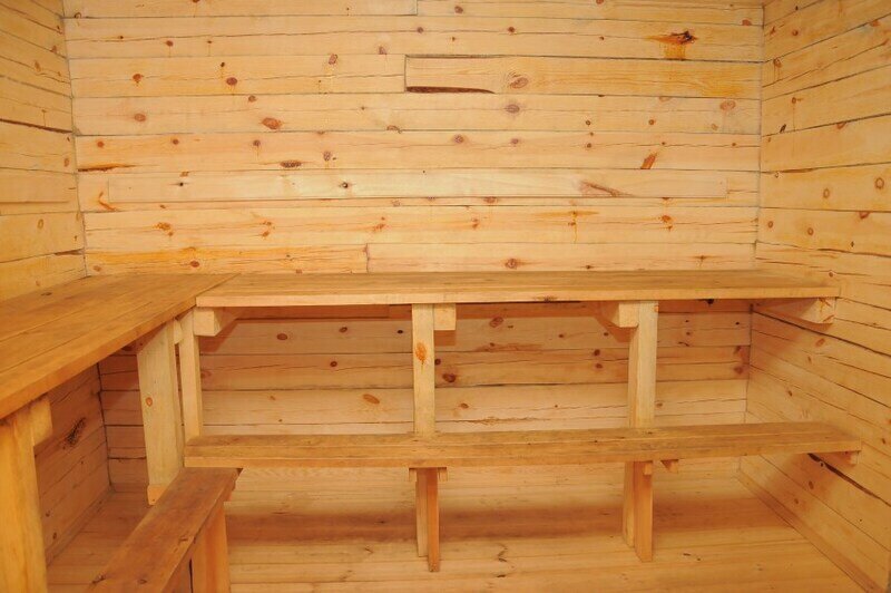 Стены в парилке сделаны из сосны и обиты осиновой рейкой для полного удобства и наслаждения. Осиновая обивка устойчива к температурам, поэтому не нагревается и не выделяет смолы. Полки сделаны из кедра. Как известно, кедр обладает полезными свойствами, имеет специфичный аромат, благодаря которому дышится легко, а воздух становится заметнее чище. Печка-каменка на дровах, передающая неповторимое тепло, держит температуру и дает легкий пар.
