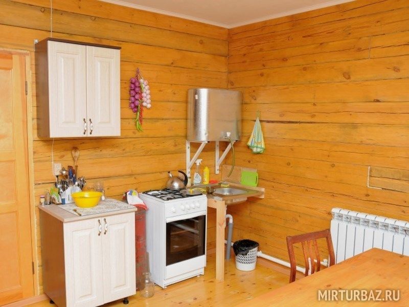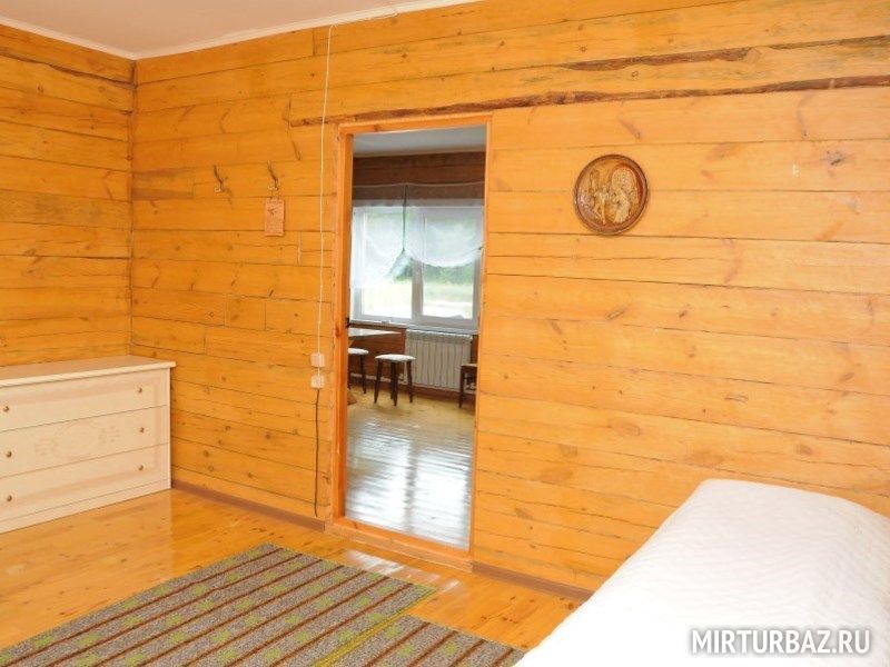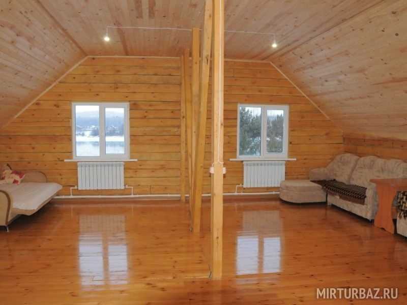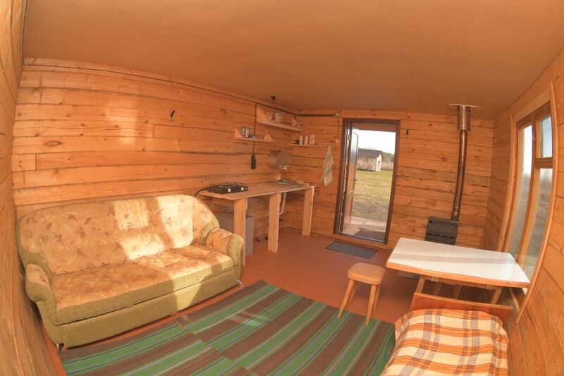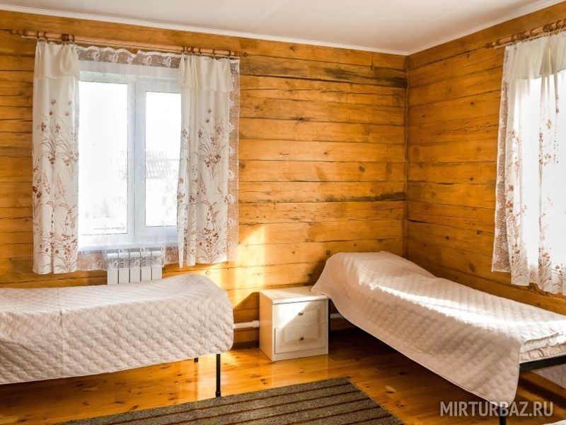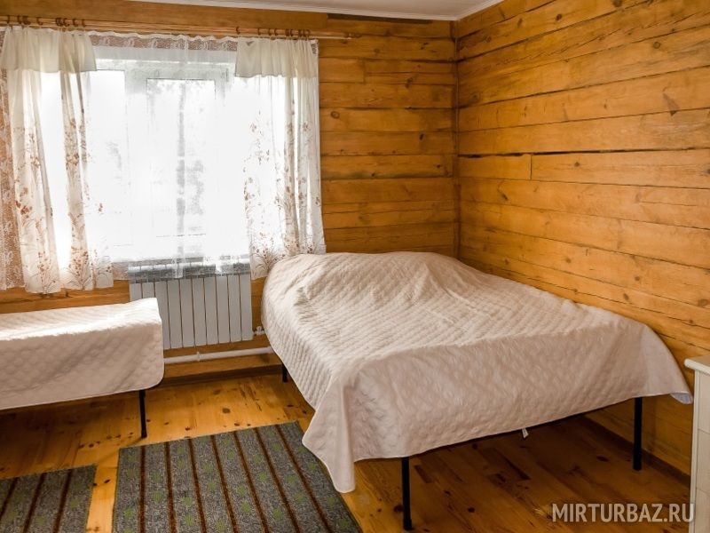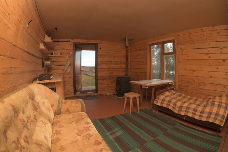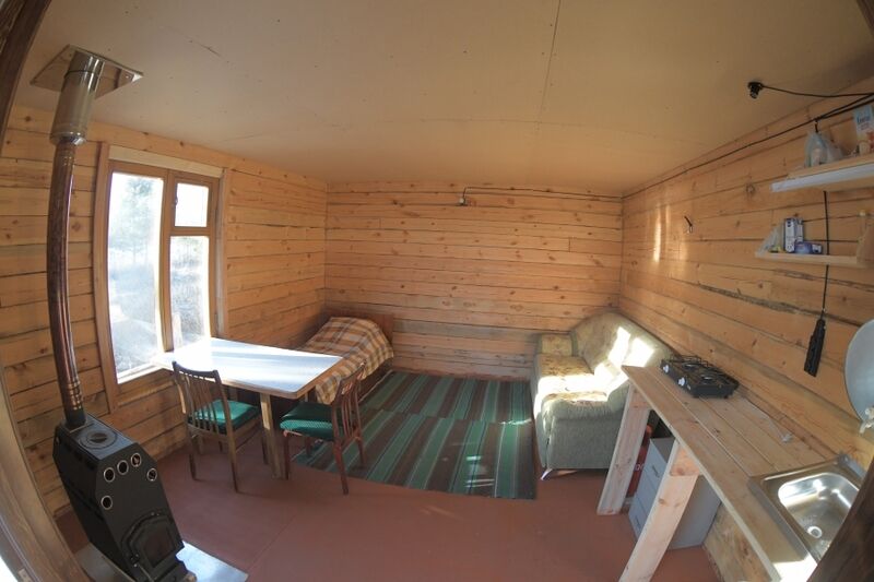 На первом этаже располагаются две отдельных комнаты на 3 и 4 человека, большой просторный холл, обеденный стол на 12 человек, кухонная зона, умывальник (холодная вода). Освещение от солнечных батарей. На втором этаже просторное помещение со спальными местами (студия), где очень любят резвиться дети и открывается прекрасный вид на реку и лес.