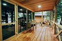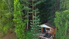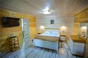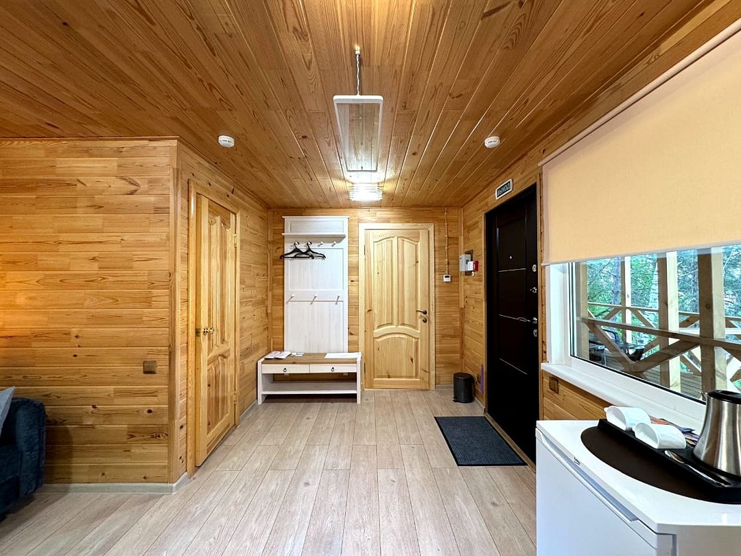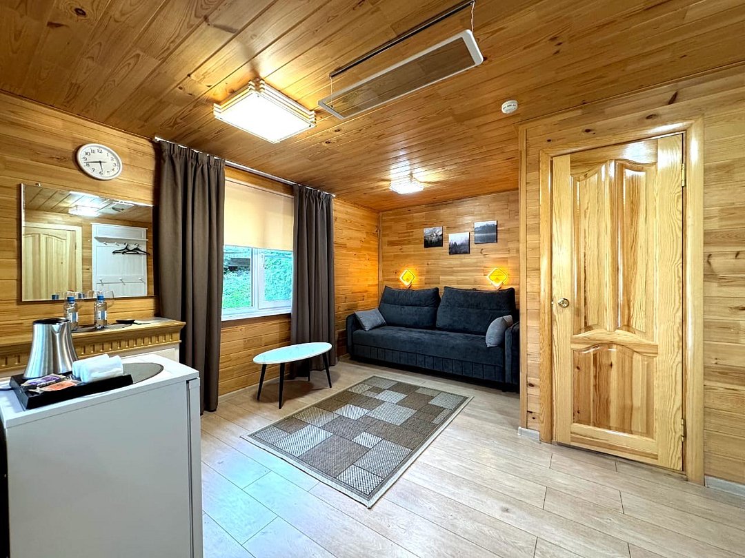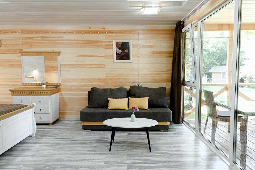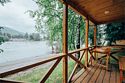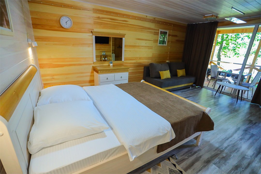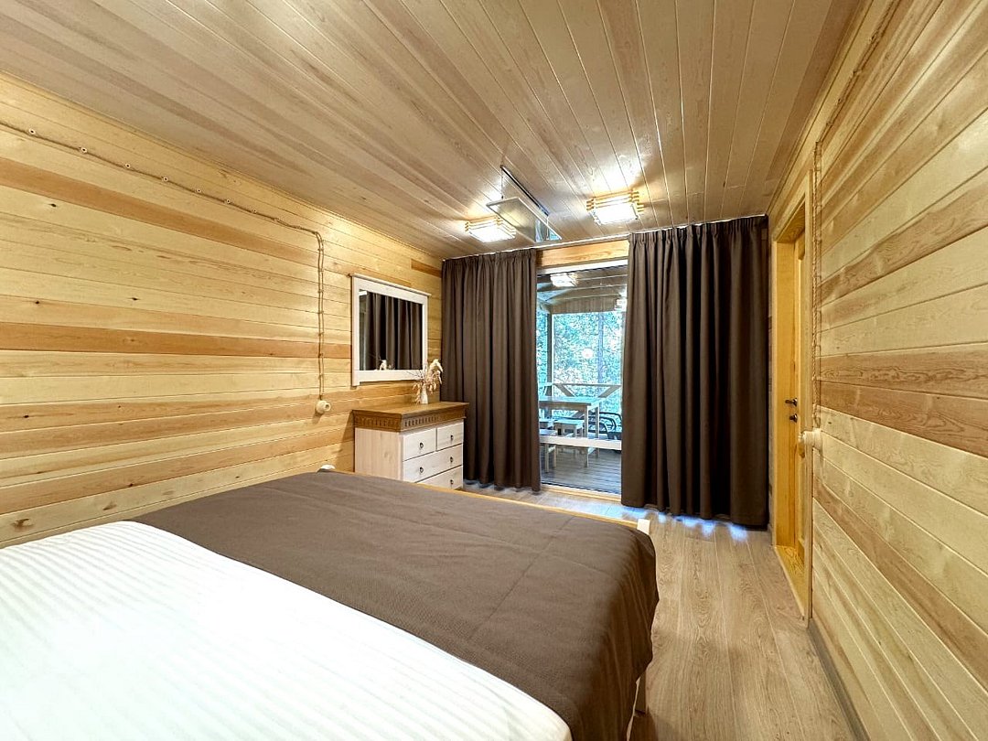 телевизор, Wi-Fi, фен, обогреватель, душевая кабина, санузел, водонагреватель, теплый пол, халаты, банные полотенца, тапочки, балкон с шезлонгом, двуспальная кровать, гардеробная, журнальный столик, зеркало, комод, вид на реку, панорамные окна, раскладной диван, мини-холодильник, теплые полы, чайная станция, уличный стол и стулья из тикового дерева, мыло, без питомцевВ домике