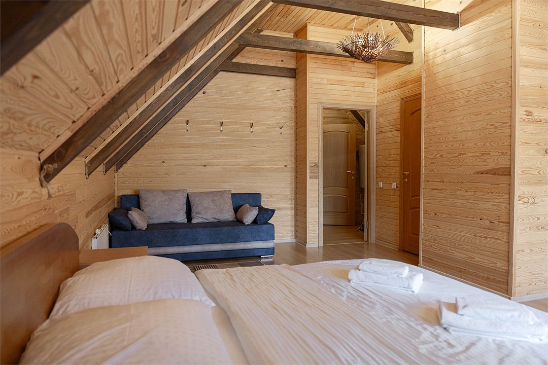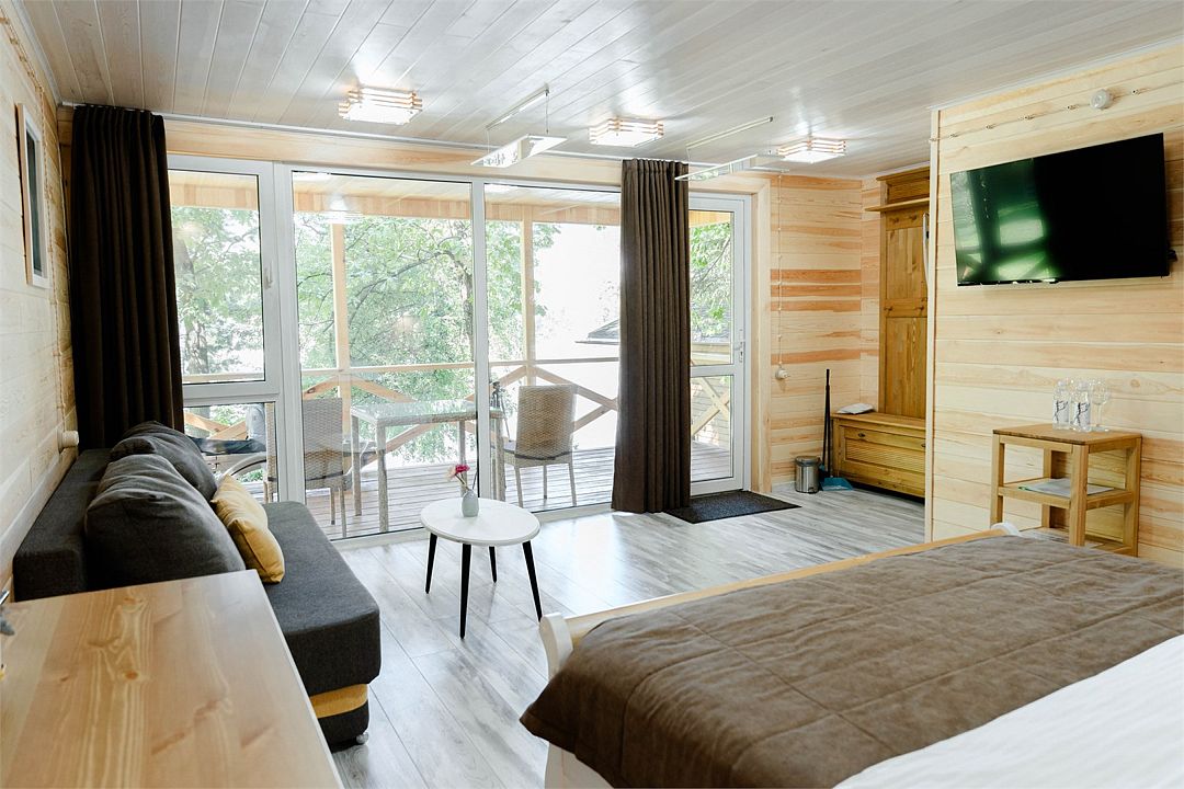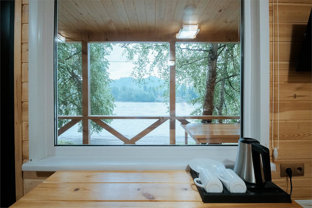 телевизор, Wi-Fi, фен, обогреватель, душевая кабина, санузел, водонагреватель, теплый пол, халаты, банные полотенца, тапочки, балкон с шезлонгом, двуспальная кровать, гардеробная, журнальный столик, зеркало, комод, вид на реку, туалетные средства, панорамные окна, раскладной диван, мини-холодильник, теплые полы, чайная станция, уличный стол и стулья из тикового дерева, без питомцевВ домике