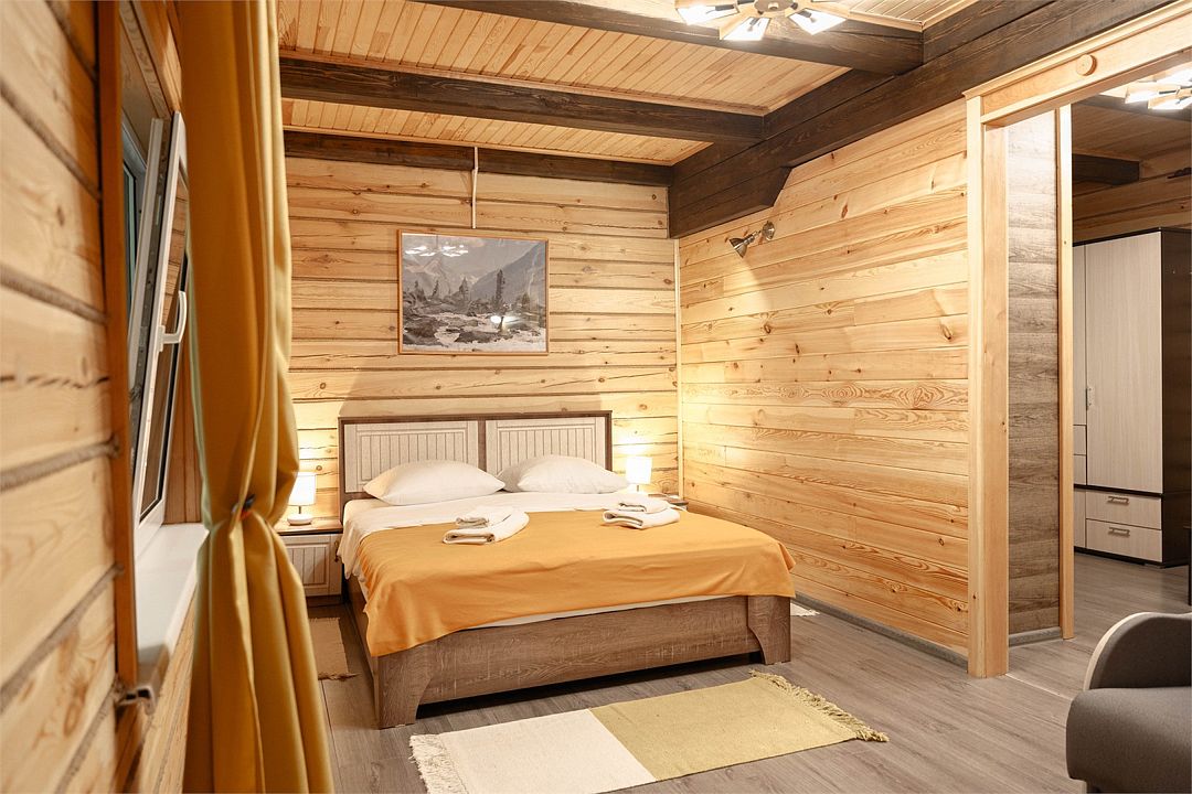 Благоустроенные домики нового формата. Номера с двуспальной кроватью, террасой с шезлонгами и видом на Катунь.Услуги и удобства