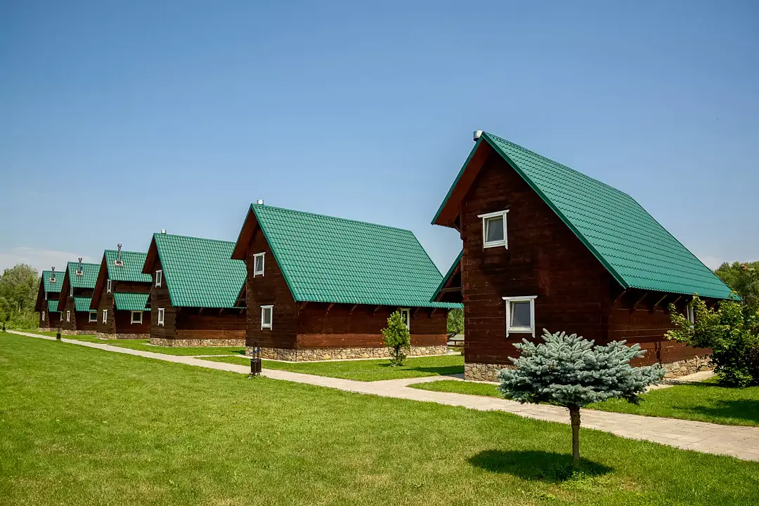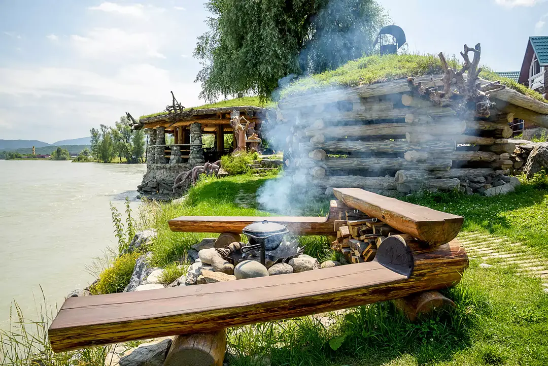 На набережной базы отдыха Медвежий угол, у самой Катуни, находятся пять беседок, срубленных из брёвен лиственницы и покрытых земляными крышами. Две из них — поменьше и рассчитаны на компанию из 4-6 человек, три — побольше, они рассчитаны на компанию из 8-10 человек.