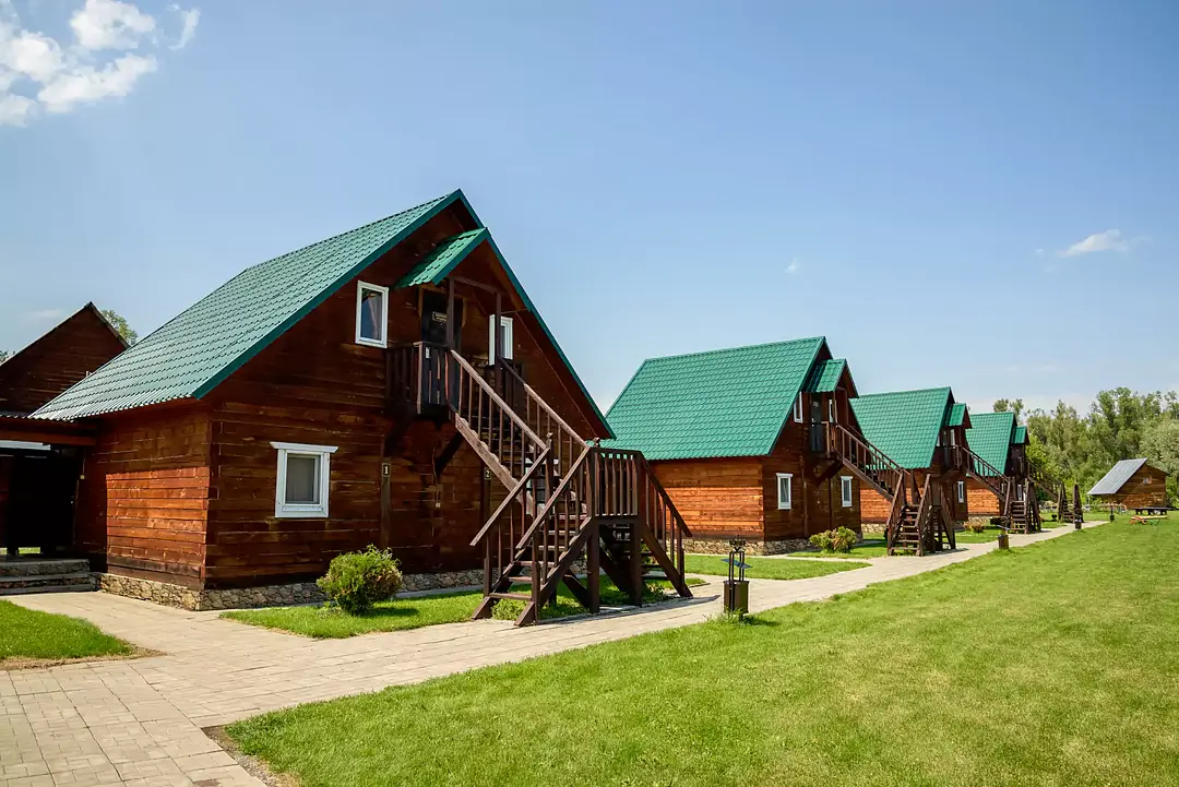 Номера «Полулюкс» расположены в двухэтажных домах, построенных из натурального кедра на второй линии.