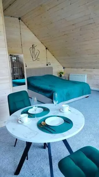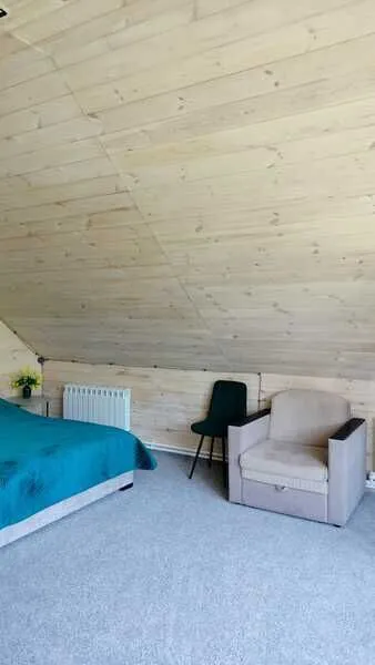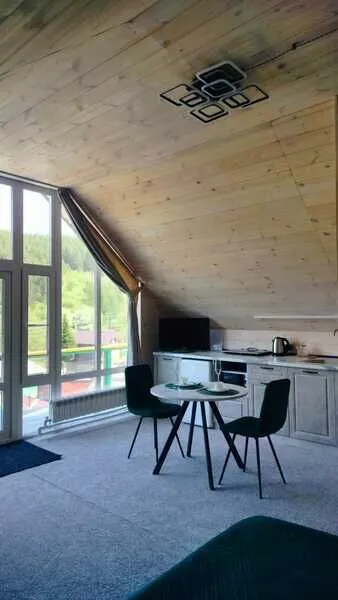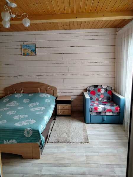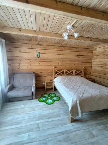 Номер с двуспальной кроватью и креслом-кроватью. Есть личный санузел, кухня-столовая.