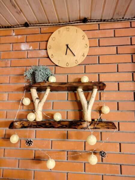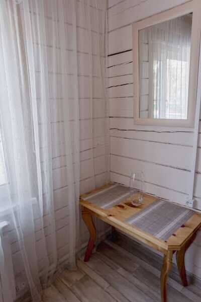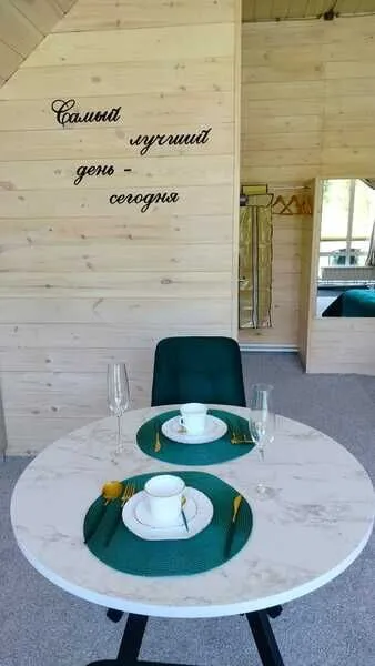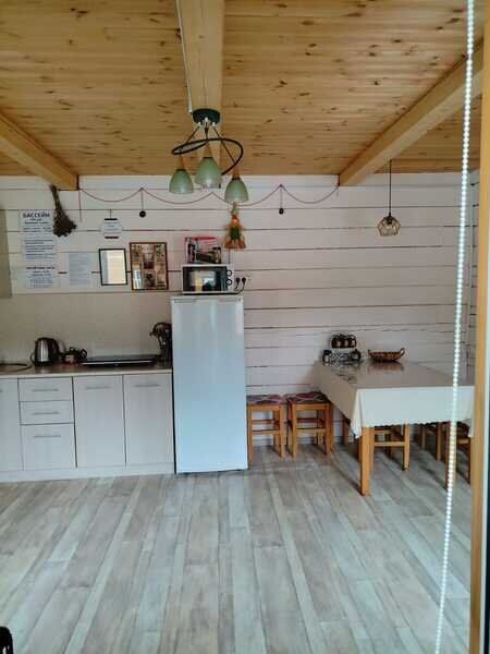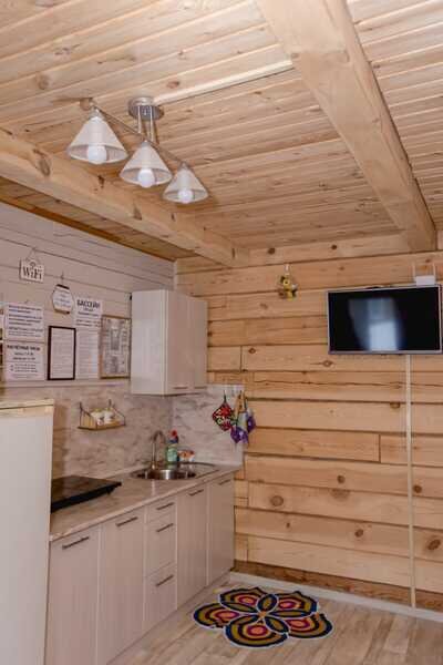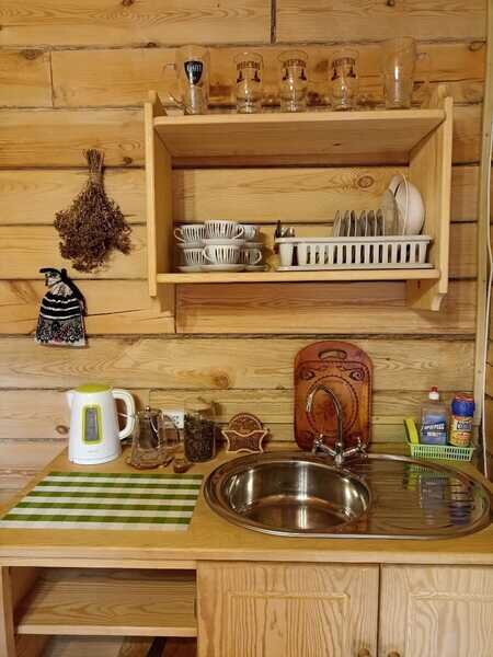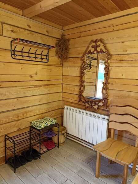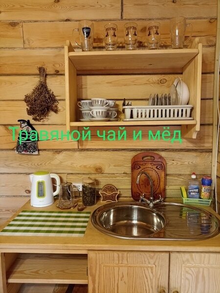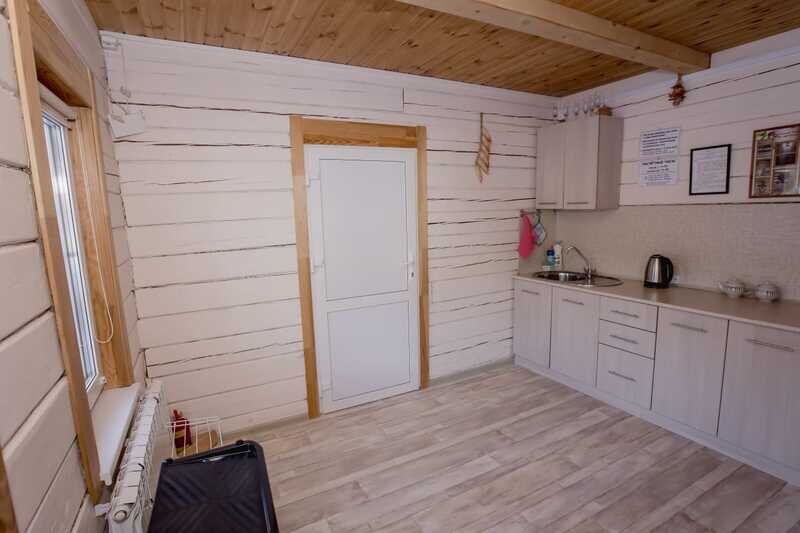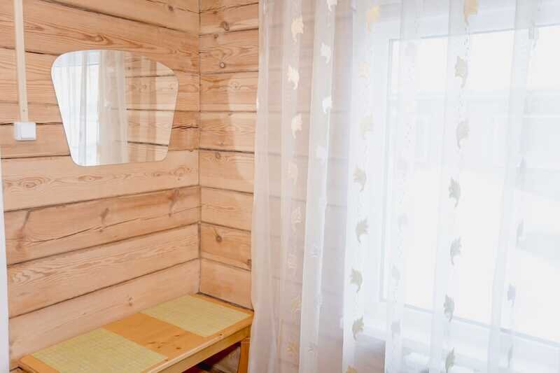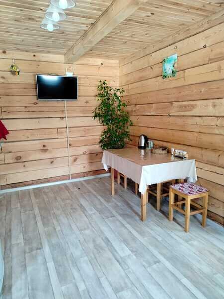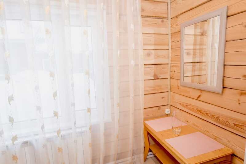 Отдельно стоит сказать о комнате отдыха. Просторная, светлая, уютная. Добротная мебель из натурального дерева подчеркивает экологичность. Для комфортного времяпровождения есть телевизор, кухонные принадлежности, чайник, посуда.