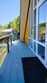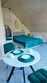 Номер с двуспальной кроватью с голубых тонах. Есть личный санузел, кухня-столовая.