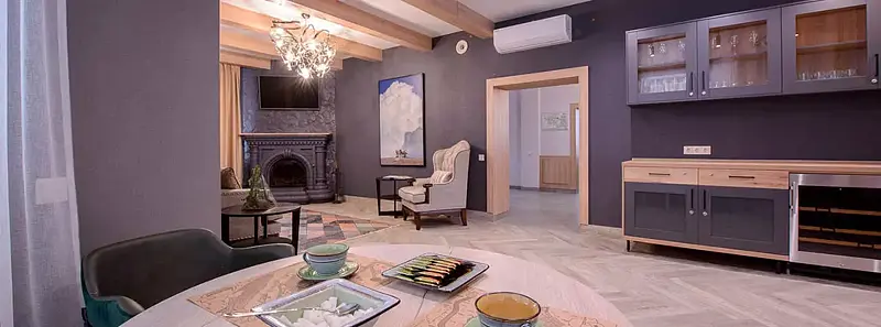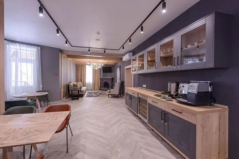 Номер состоит из спальни, просторной гостиной с кухонной зоной, санузлом с душевой кабиной, зоной отдыха.