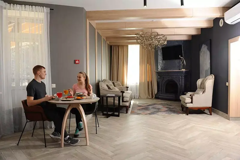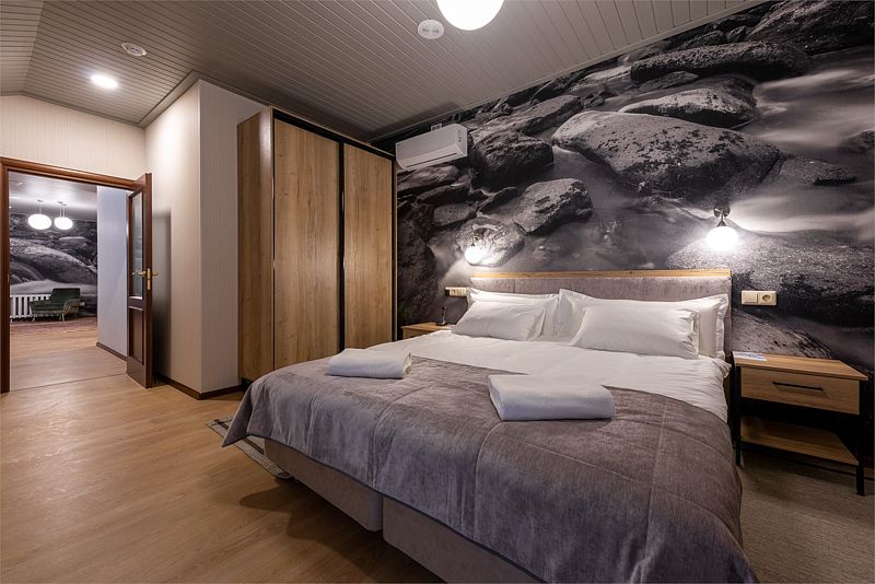 Номер состоит из спальни, просторной гостиной, санузлом с душевой кабиной, зоной отдыха.