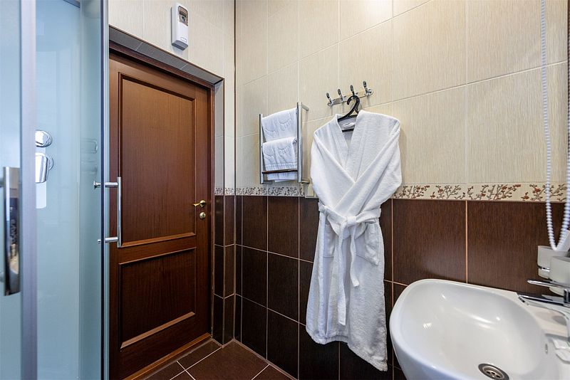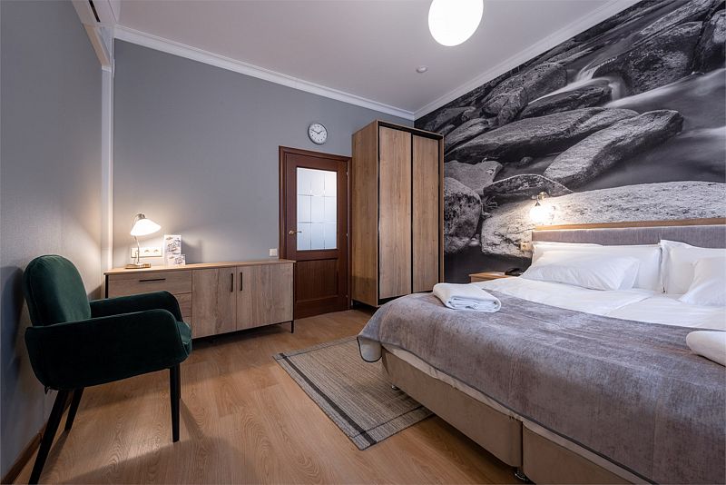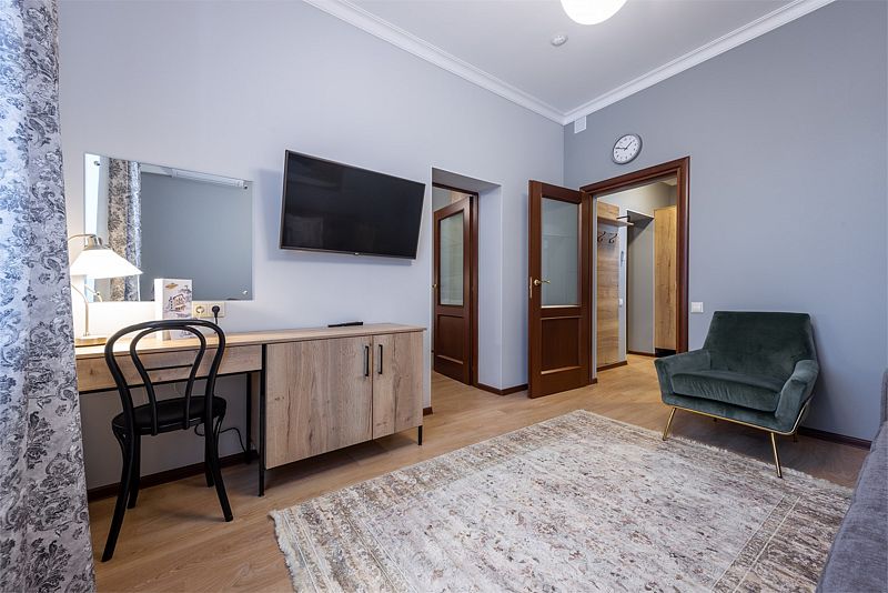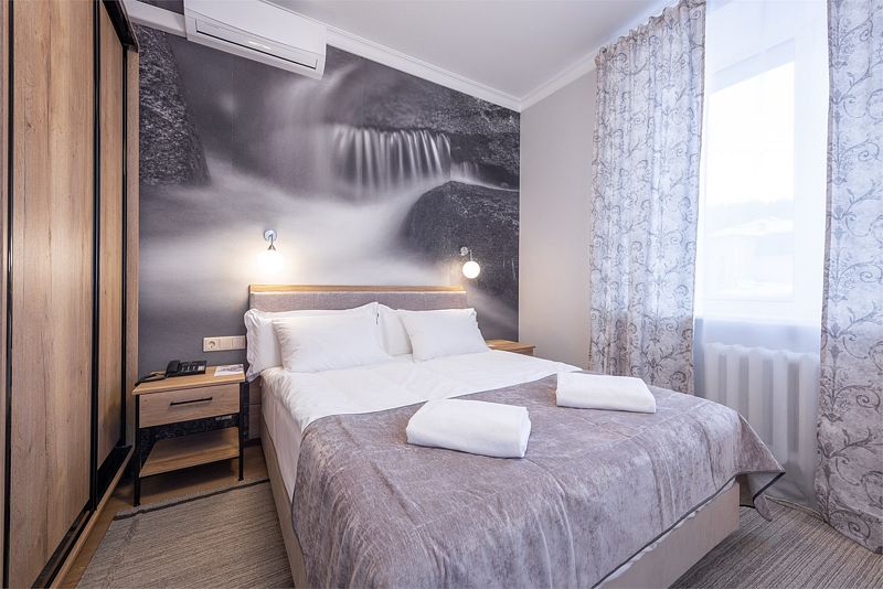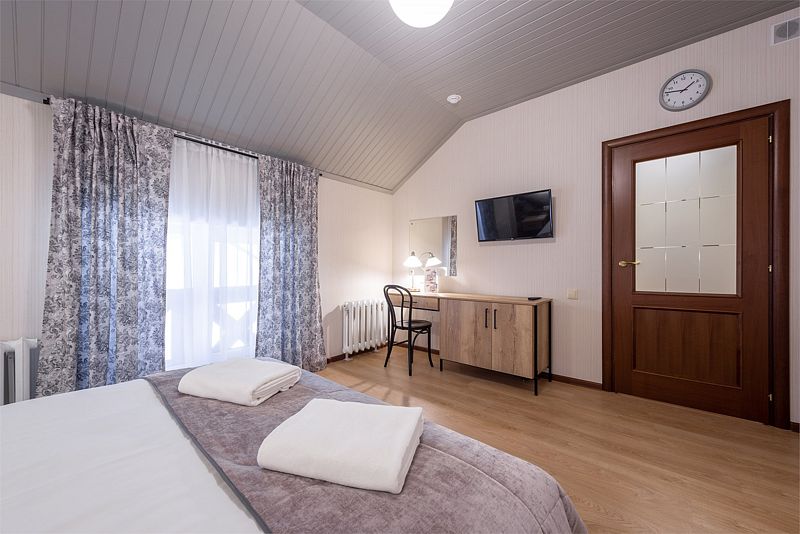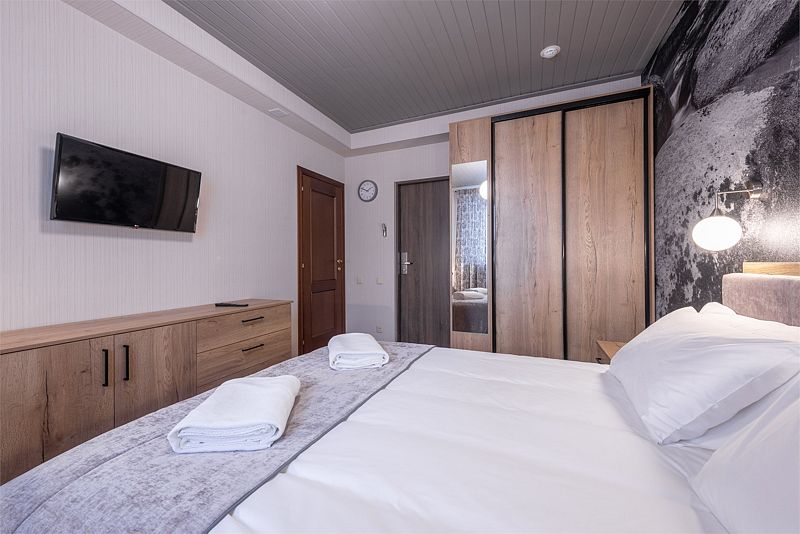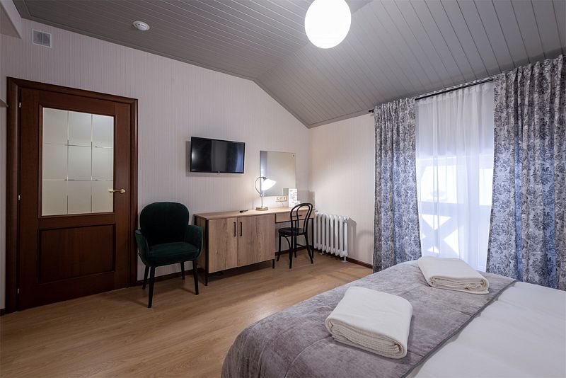 Просторный двухкомнатный номер 33 кв.м., состоящий из прихожей, спальни, просторной гостиной, санузел оборудован душевой кабиной.
