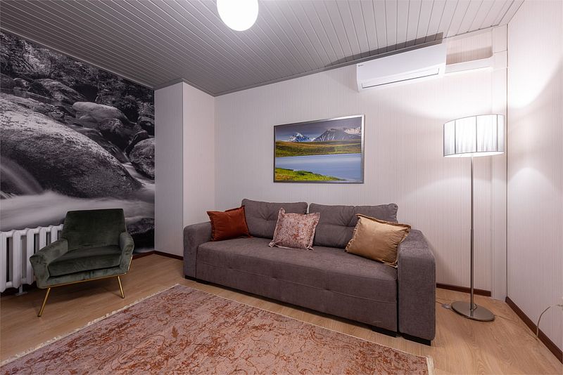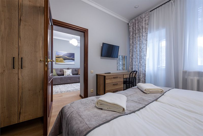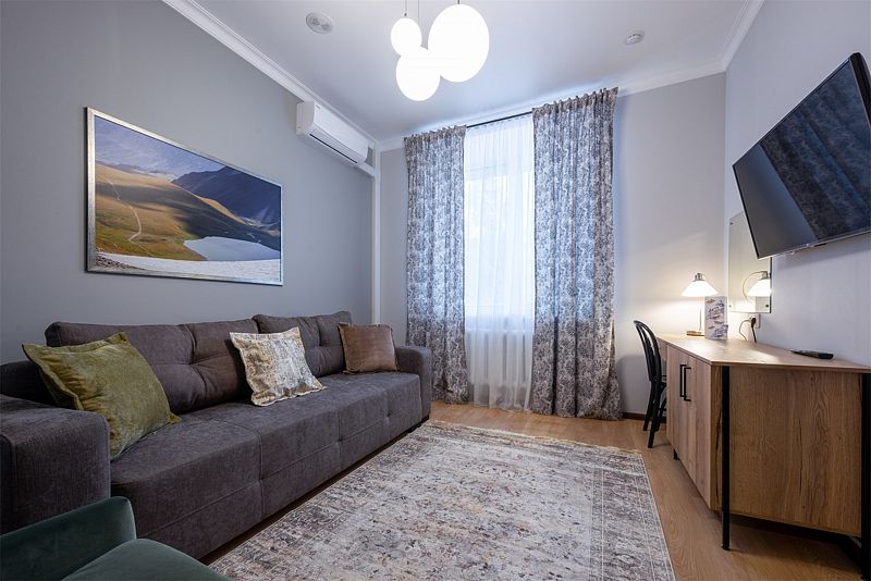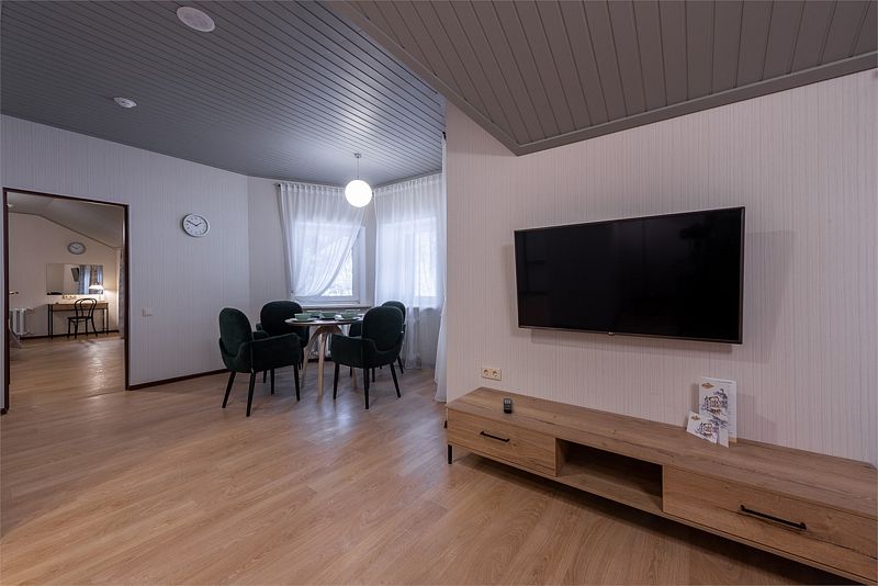 Двухкомнатный номер 55 кв.м. Возможно комфортное размещение двух гостей, а также дополнительное размещение на диван-кровати.