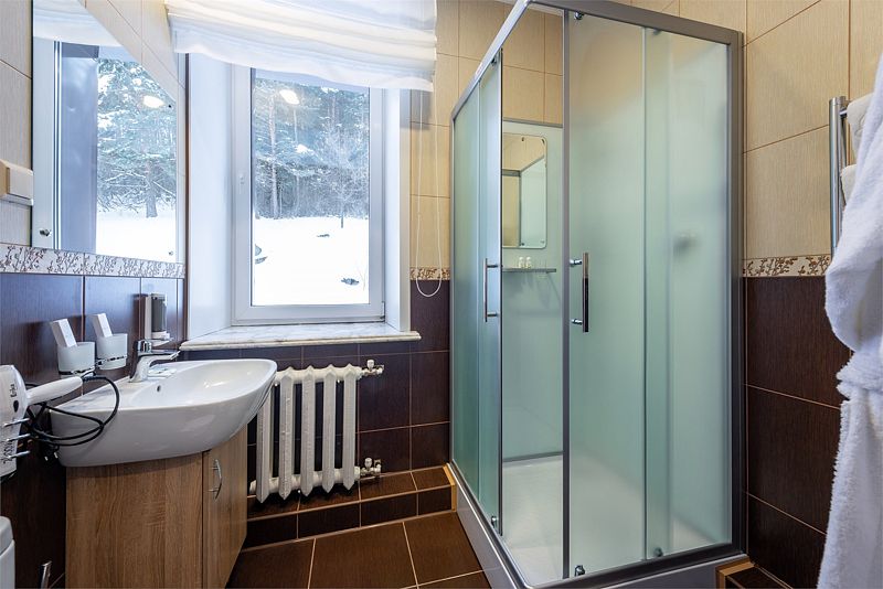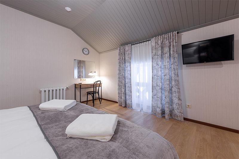 Просторный номер площадью 28 квадратных метров, состоящий из прихожей, гостиной зоны и спальни. Санузел с душевой кабиной.