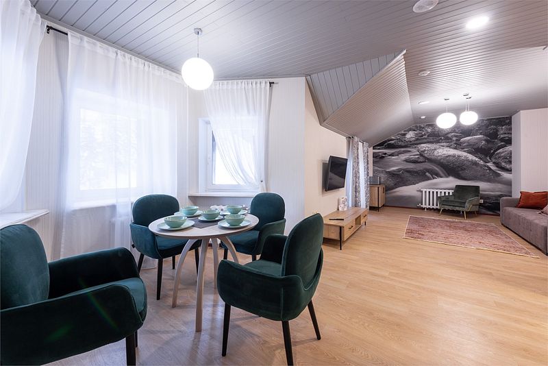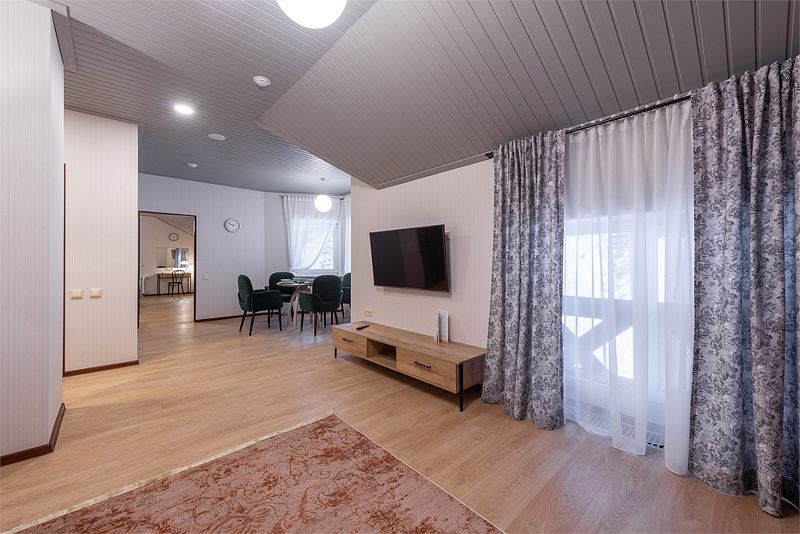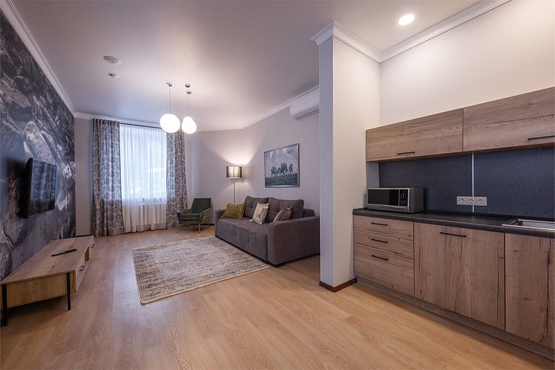 Двухкомнатный номер 63 кв.м. с кухонной зоной. Возможно комфортное размещение двух гостей, а также дополнительное размещение на диван-кровати.