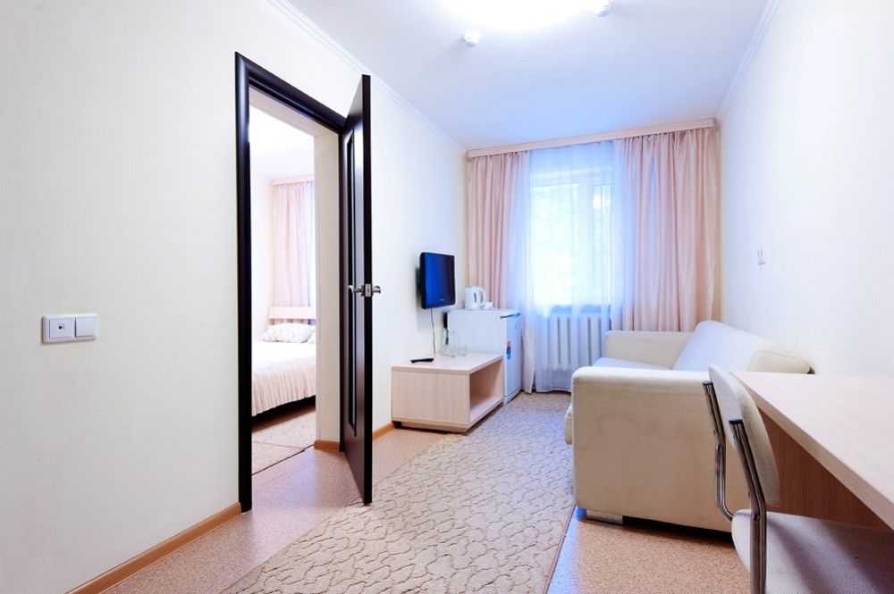 Санаторий включает в себя два жилых здания, соединенных переходами с лечебным корпусом, пантолечебным центром и столовой. В распоряжении гостей номера разных категорий комфорта - есть как бюджетные варианты с общим санузлом на блок, так и просторные двухкомнатные номера. Во всех номерах имеются холодильник и телевизор, в некоторых также предусмотрен электрочайник.