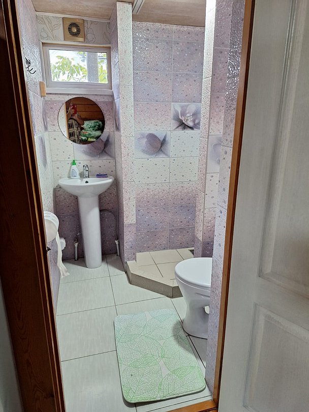 В каждом номере - санузел с душевой кабиной, диван раскладной и кровать 1-местная, телевизор. Чайник и холодильник общие на 2 номера, находятся на террасе.