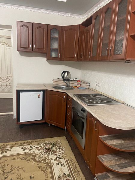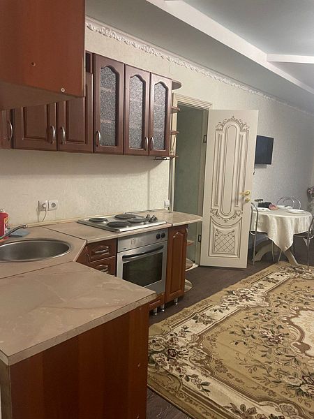 Кухня, санузел, стол, стулья, шкаф.