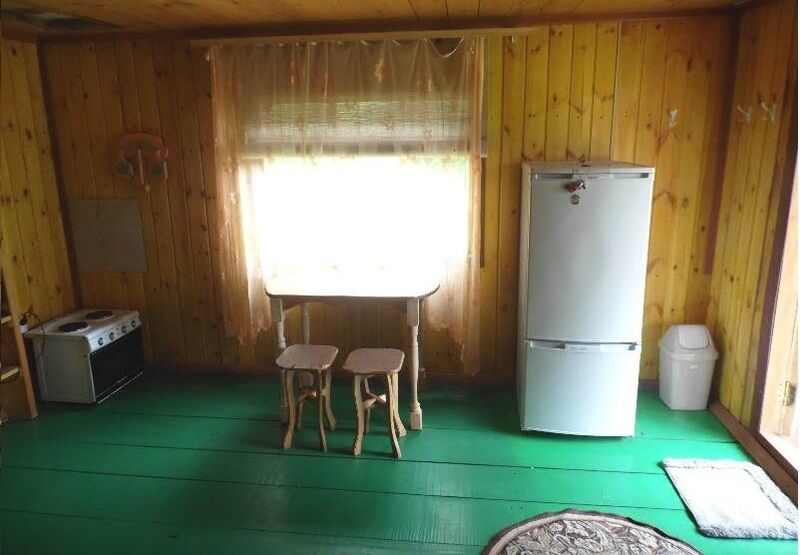 В холодное время отапливается печкой. В доме одна комната, в которой находятся двуспальная кровать и раскладной диван, кухонный уголок (холодильник, плита). Туалет на улице.