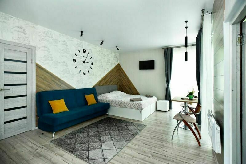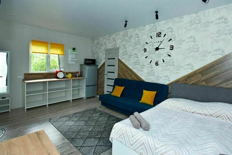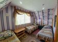 Номер рассчитан на 4 человека: 2 сдвоенные кровати, общий размер 160х200 мм, диван, который раскладывается, кухонная зона, с посудой, холодильник, микроволновка, телевизор, душ, туалет.