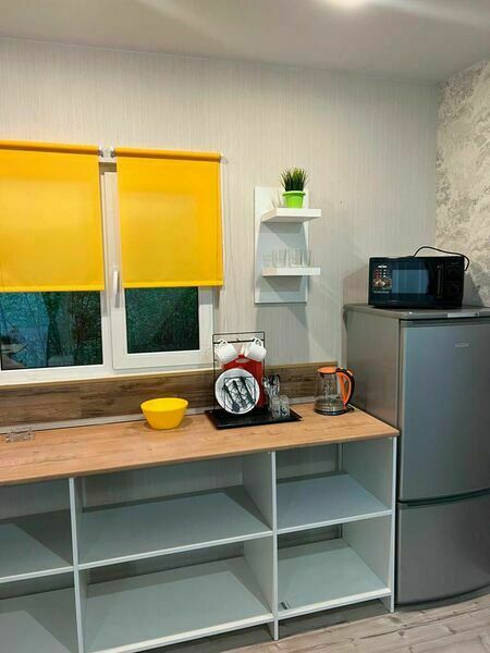 Кухонная зона с набором посуды, микроволновка, холодильник, кровать размером 140-200 см, диван, зеркало.