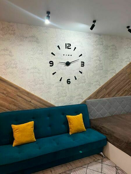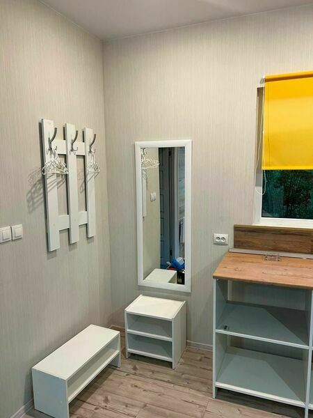 Одна кровать, диван, журнальный столик, зеркало, вешалка, коврик, шторы, розетки, электричество.