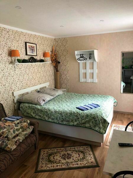 Одна двуспальная кровать, размер: 140-200, журнальный столик, зеркало, вешалка, коврик, шторы, розетки, электричество, чайник.