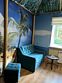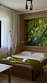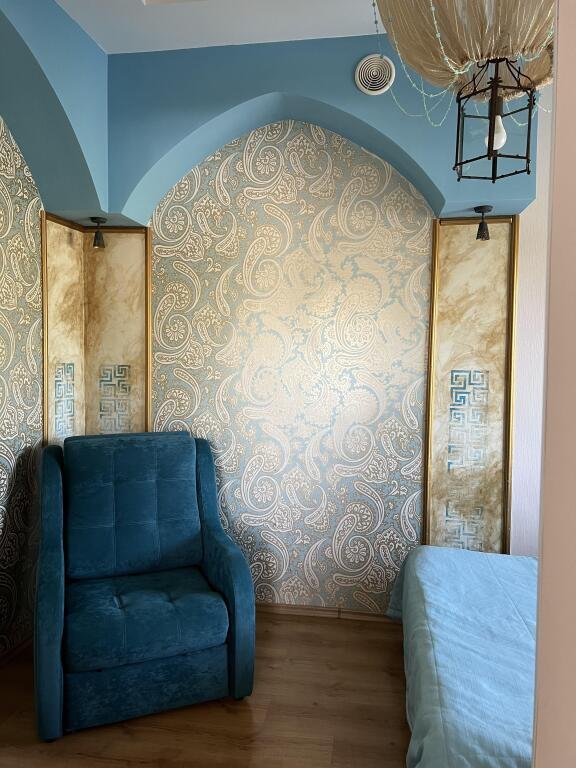 Авторский двухкомнатный номер. В отделке номера использованы фотообои с изображением морского берега, яркие цвета, обои из тростника, натуральный бамбук и камыш.