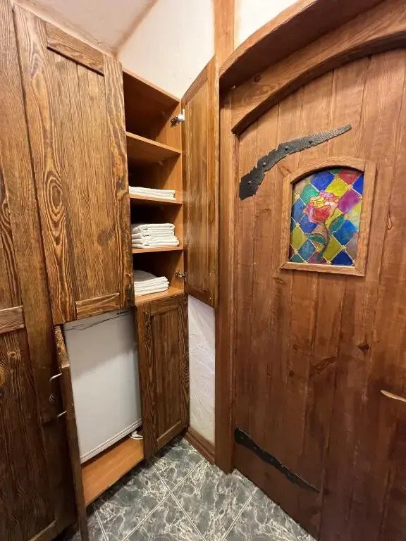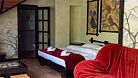 В спальной комнате стеклянная люстра — попугай. Межкомнатная дверь. В номере двуспальная кровать, диван 140 см. Чайная комната — в холле на 2 этаже.