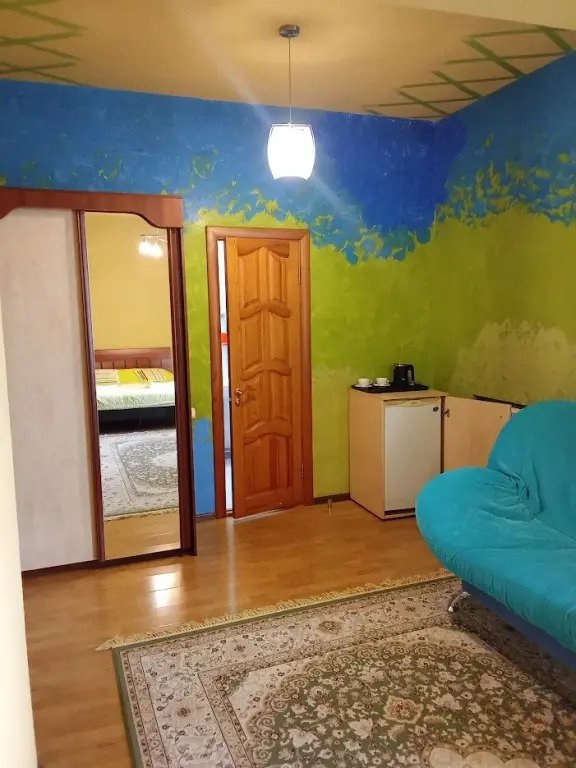 Межкомнатной двери нет. В номере двуспальная кровать, диван 140 см. Чайная комната — в холле на 2 этаже.