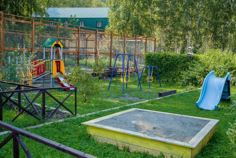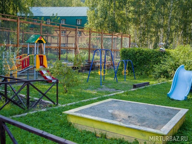 Для детей оборудована игровая площадка с горками, качелями и песочницей.