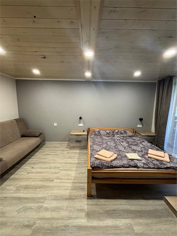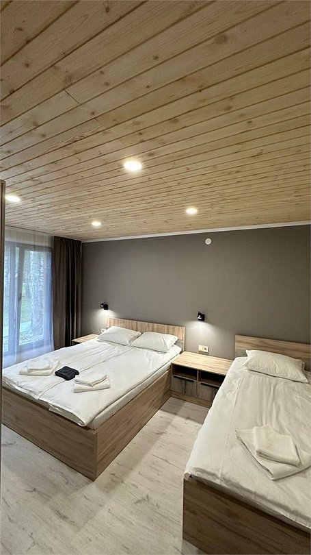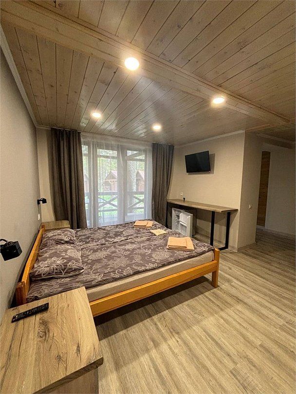 Большая терраса, собственная мангальная зона В гостиной: шкаф для одежды, набор мягкой мебели, журнальный столик, телевизор, кухонная зона (мини-кухня с мойкой и электроплитой, чайник, холодильник, печь СВЧ, набор посуды), столовая зона (стол, мягкие стулья) В спальной комнате: прикроватные тумбочки, стол, телевизор Санузел: туалет, умывальник, душ Вид корпусов: благоустроенный каменный/деревянный коттедж на 2-4 номераУслуги и удобства