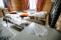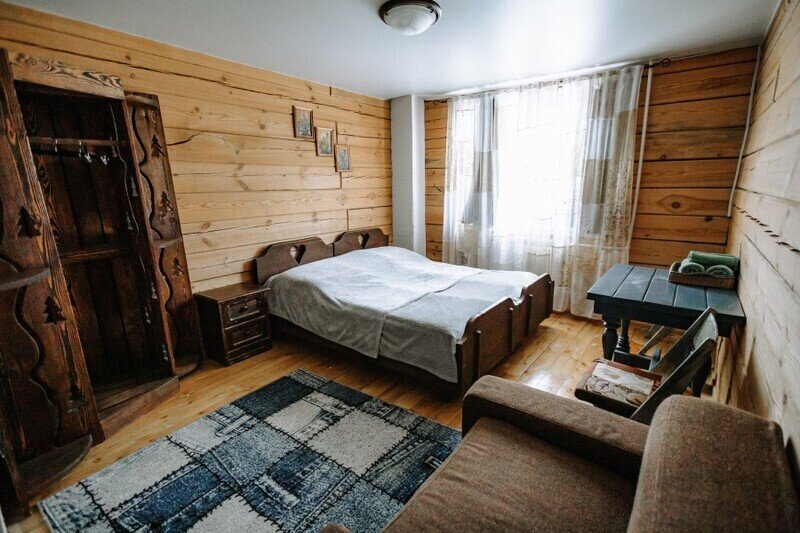 Двухместный номер, площадью 20 кв.м, с видом на горы и лес. В номере размещены 1 двуспальная кровать, стол, тумбочки, комод, телевизор со спутниковыми каналами, санузел. А также есть гостиная зона и кухонные принадлежности.