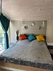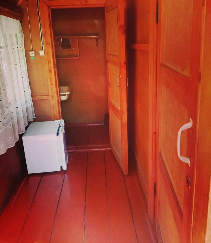 В нем полутораспальная и односпальная кровать размером 120*195 и 80*195 см, столик, 2 табуретки, вешалка, зеркало, умывальник, холодильник.