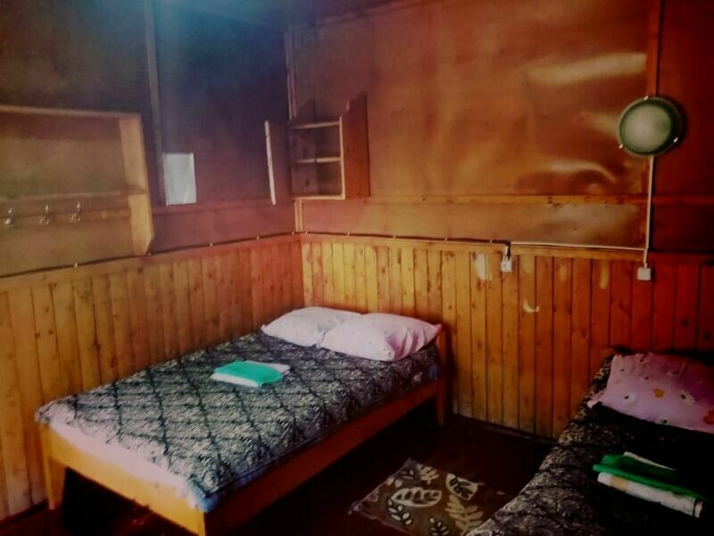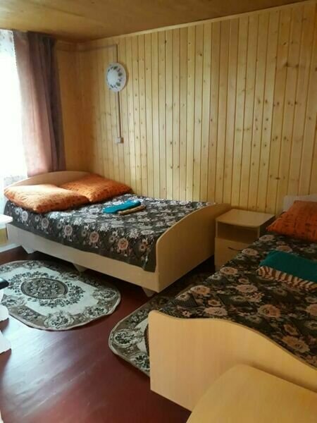 Номера в двухэтажном коттедже на первом этаже. В номере полутораспальная и односпальная кровати (3-й считается по стоимости дополнительного размещения), 2 табуретки, стол, холодильник, чайник, обогреватель, санузел с умывальником (горячая, холодная вода), унитазом и душем.