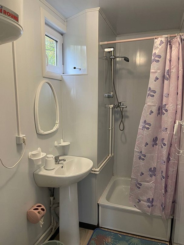Санузел для категории Б2 расположен рядом с коттеджем в отдельном помещении, один на 2 номера. В санузле: унитаз, раковина, душ, вода горячая и холодная.