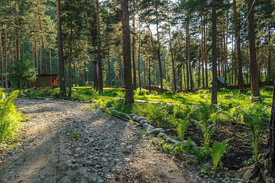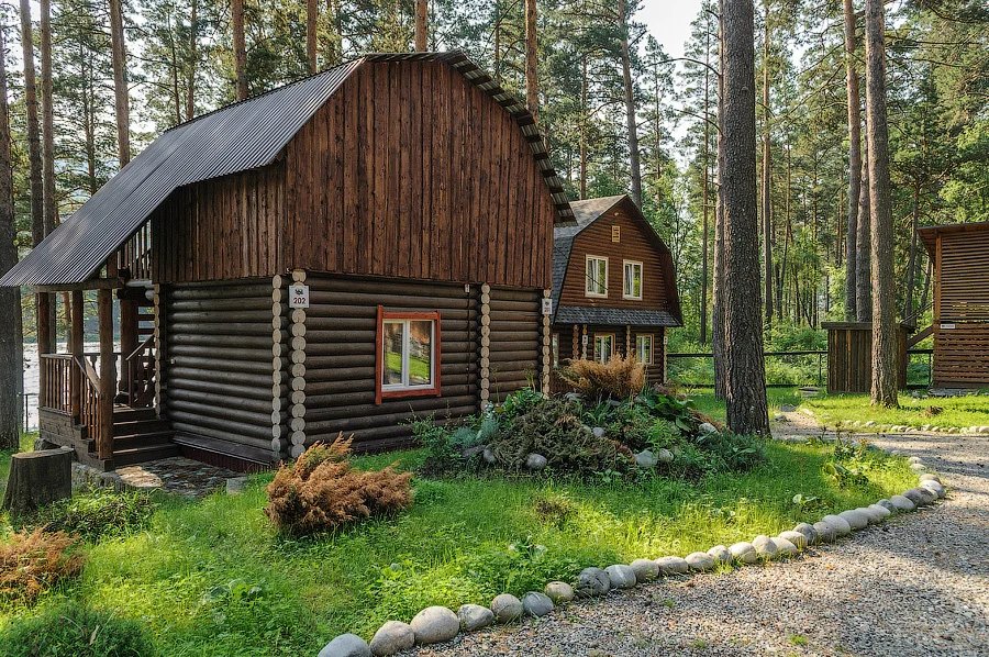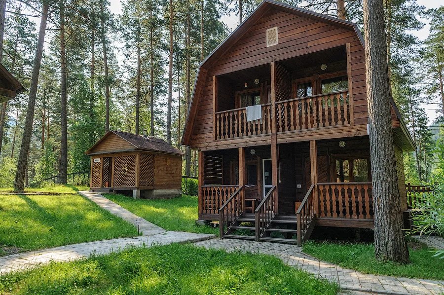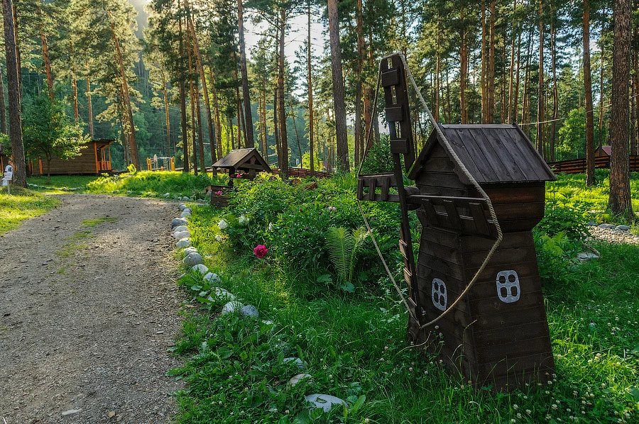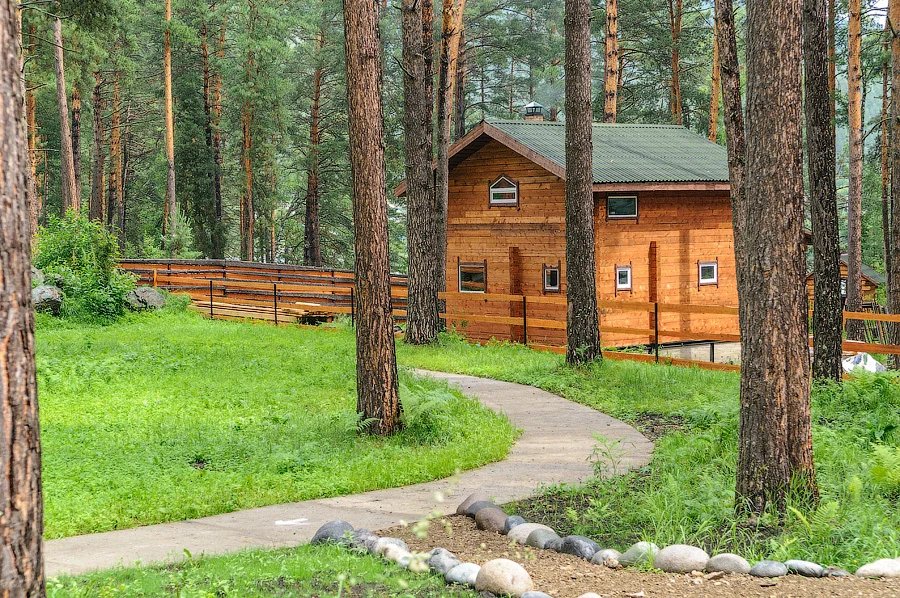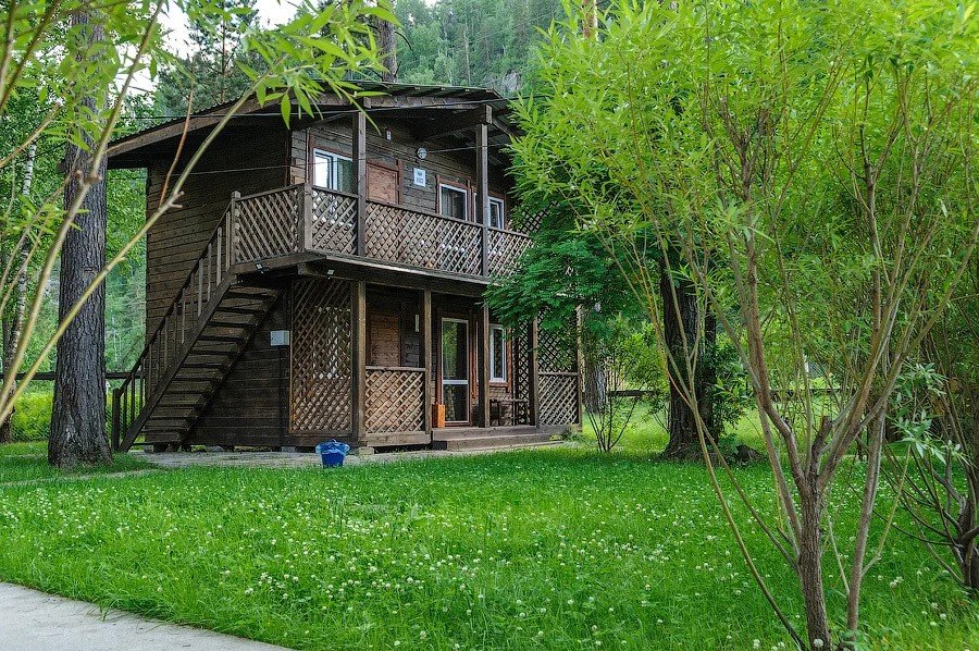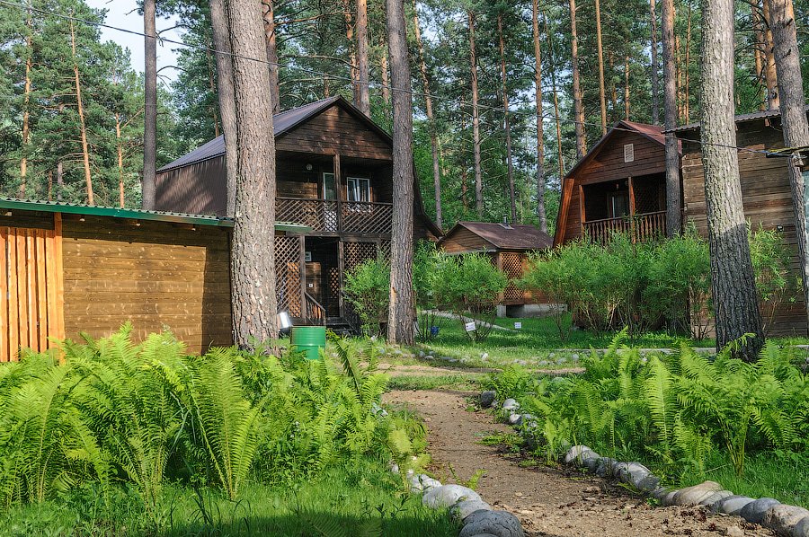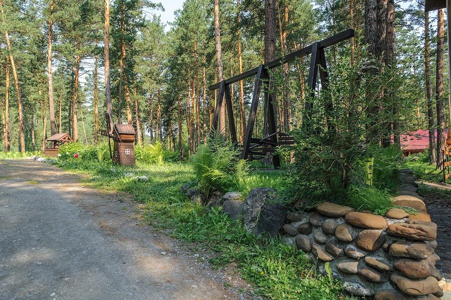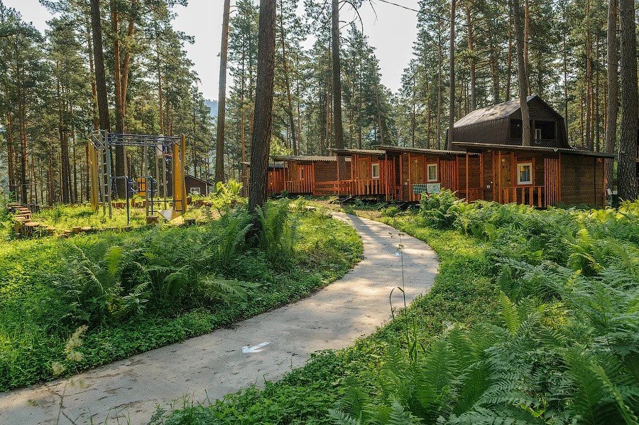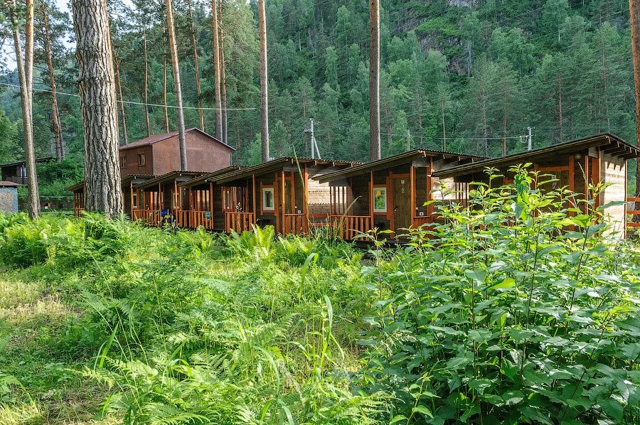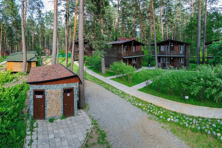 Эко-деревня занимает просторную территорию площадью 1,5 гектара, освещаемую в темное время суток и находящуюся под круглосуточной охраной. Для гостей проложены пешеходные и велосипедные дорожки, зоны отдыха и беседки, игровые и спортивные площадки. Для проживания предлагаются деревянные дома, выполненные из настоящего кедра, пихты и сосны. Дома органично вписаны в окружающий пейзаж, утопают в зелени и деревьях, при этом размещены на таком расстоянии друг от друга, чтобы соседи не мешали уединенному отдыху. Большая часть домов – двухэтажные, но есть и дома в один этаж – Кедровый и Комфорт+. Все номера укомплектованы необходимой мебелью, холодильником и персональным санузлом с душевой кабиной. В ряде домов оборудована кухня, есть террасы и балконы, откуда открываются живописные виды на реку и горы.