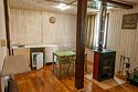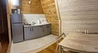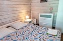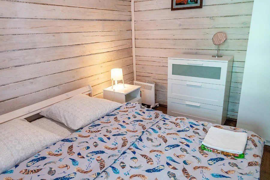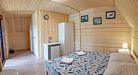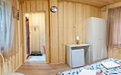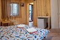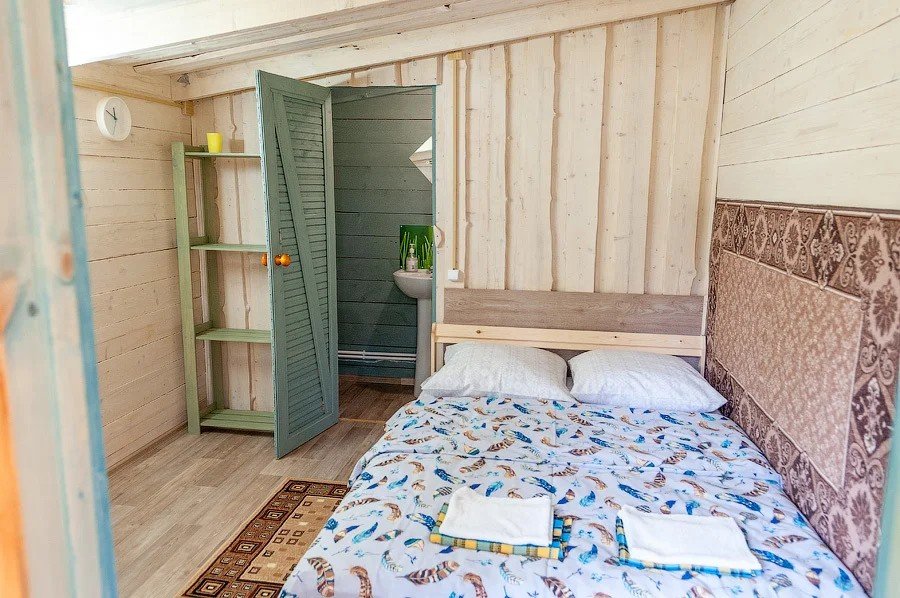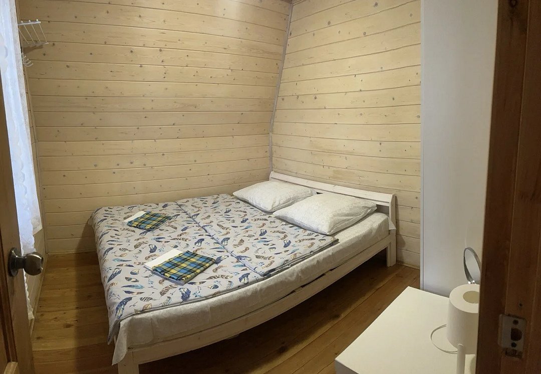 Одноэтажный, двухкомнатный дом, с кухней-гостиной. Двуспальные кровати, двухъярусная кровать, кухонная зона, холодильник, чайник, с/у с душевой.