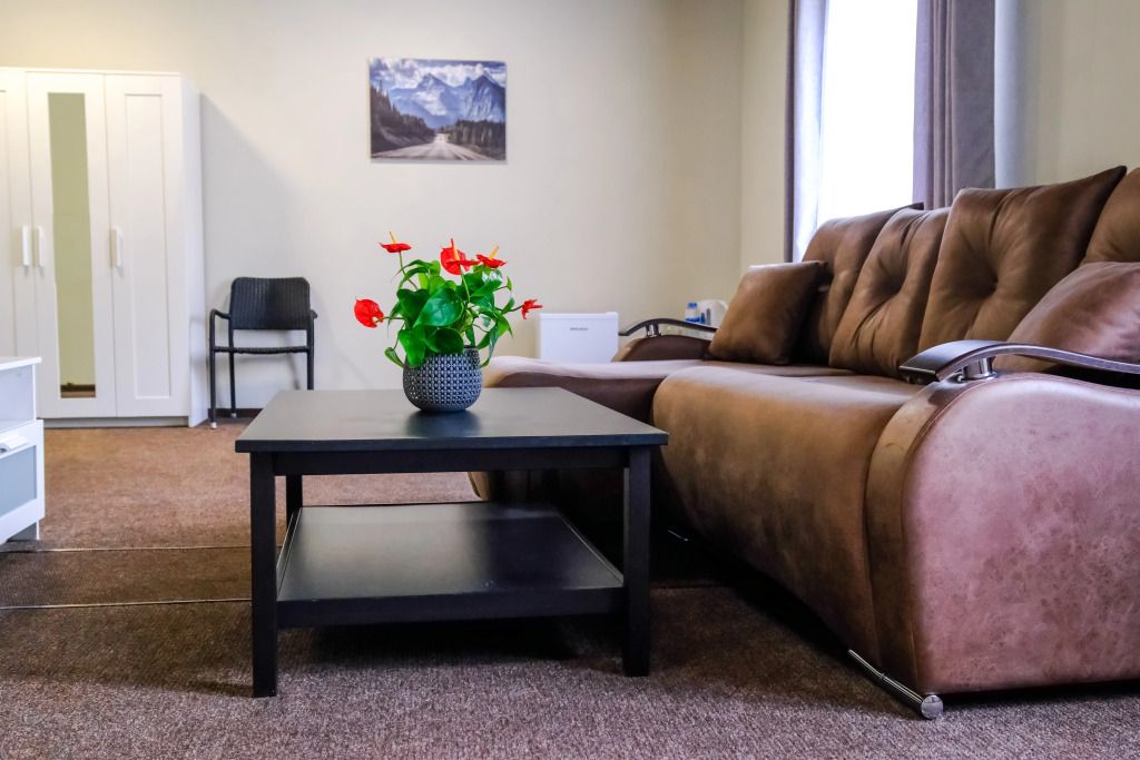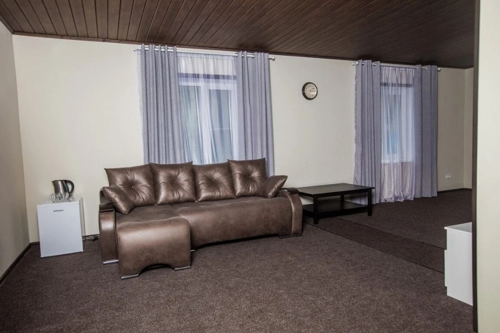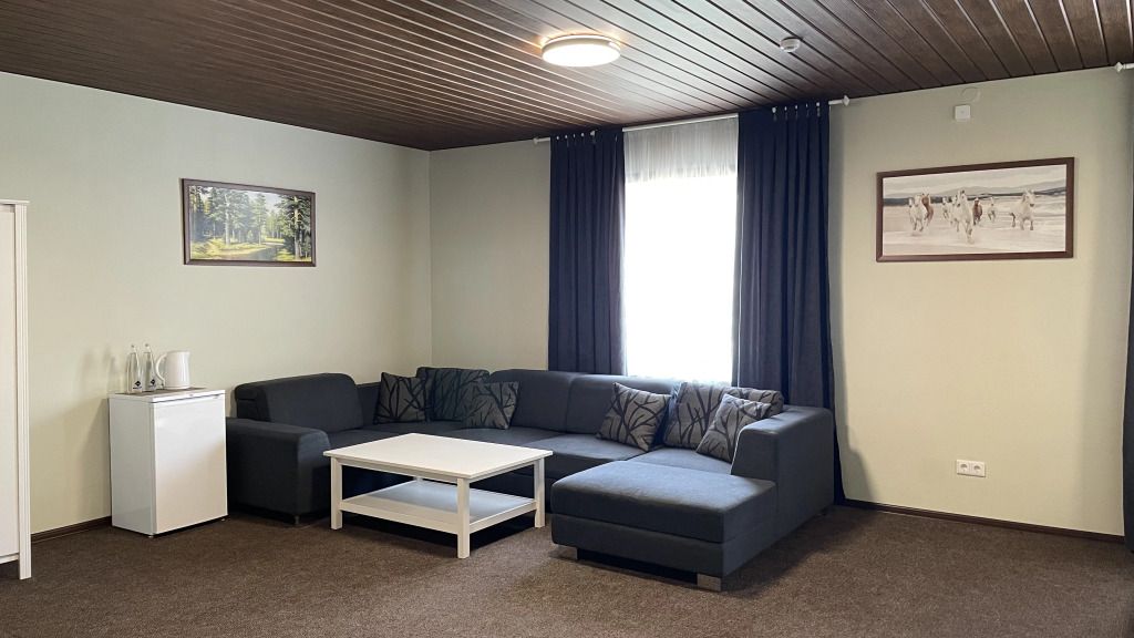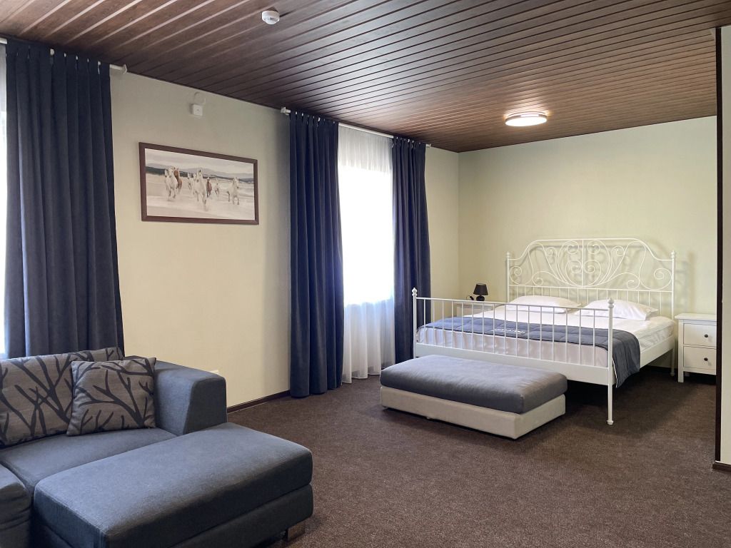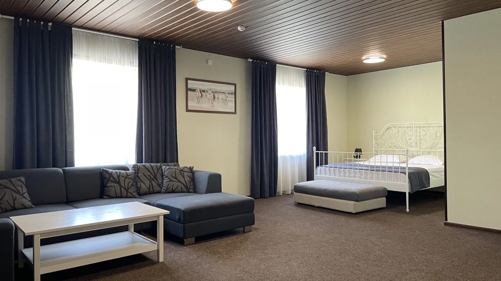 Просторный номер-студия площадью 46 м2 на трех человек. Большая туалетная комната с душем. Большая двуспальная кровать, диван с журнальным столиком, ТВ.