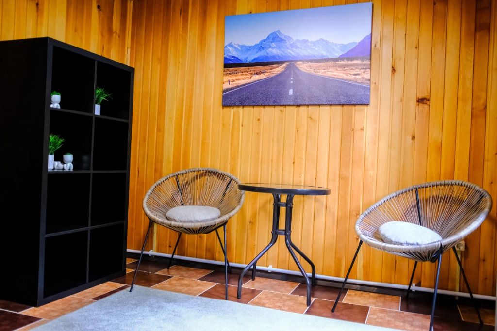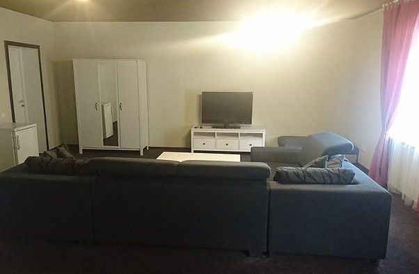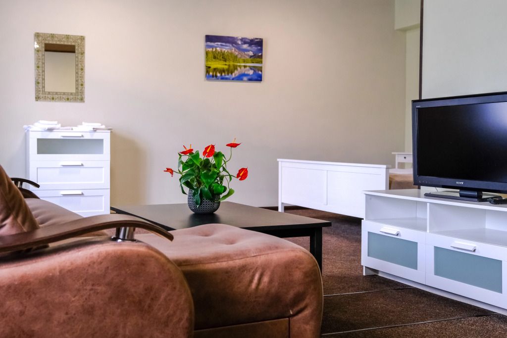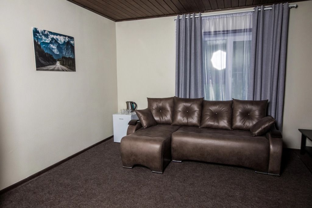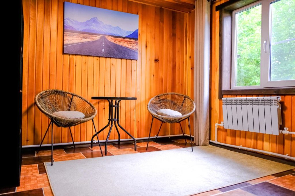 Просторный номер-студия площадью 46 м2 на трех человек. Большая туалетная комната с душем. Большая двуспальная кровать, диван с журнальным столиком, ТВ.
