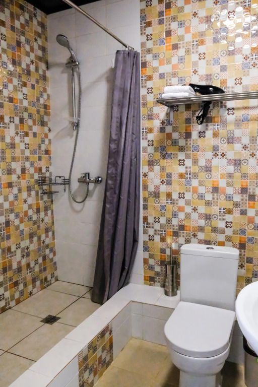 Двухэтажный номер площадью 40 м2 в гостинице. На первом этаже раскладывающийся диван, телевизор, сан. узел с душем. На втором этаже двуспальная кровать, сан. узел без душа.