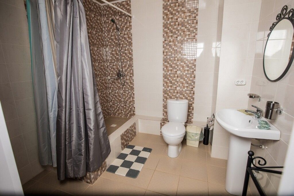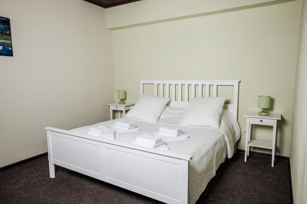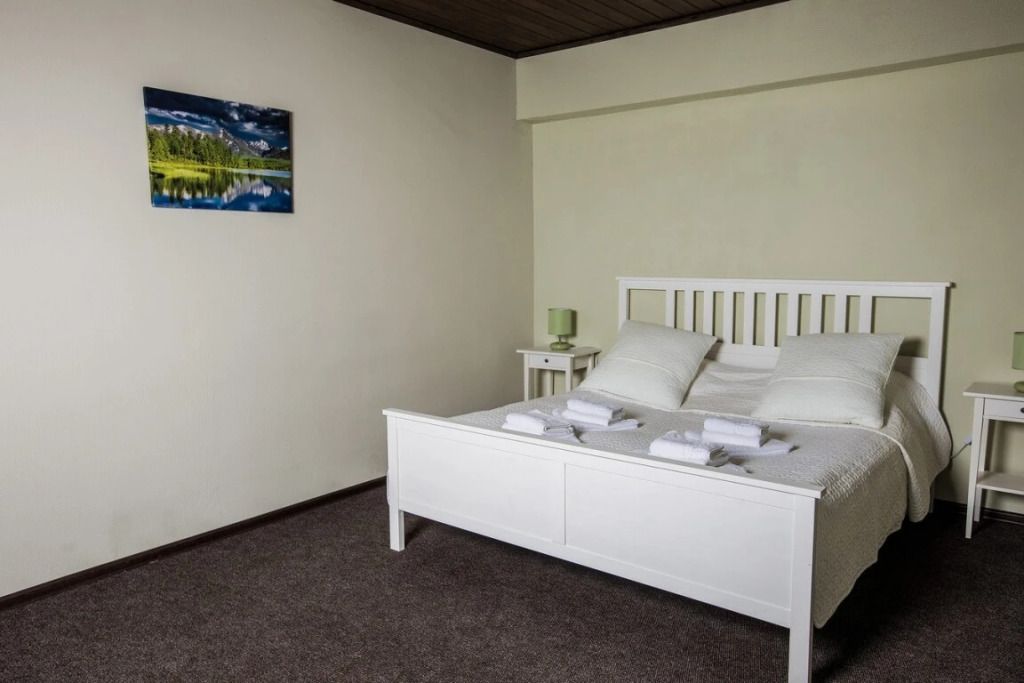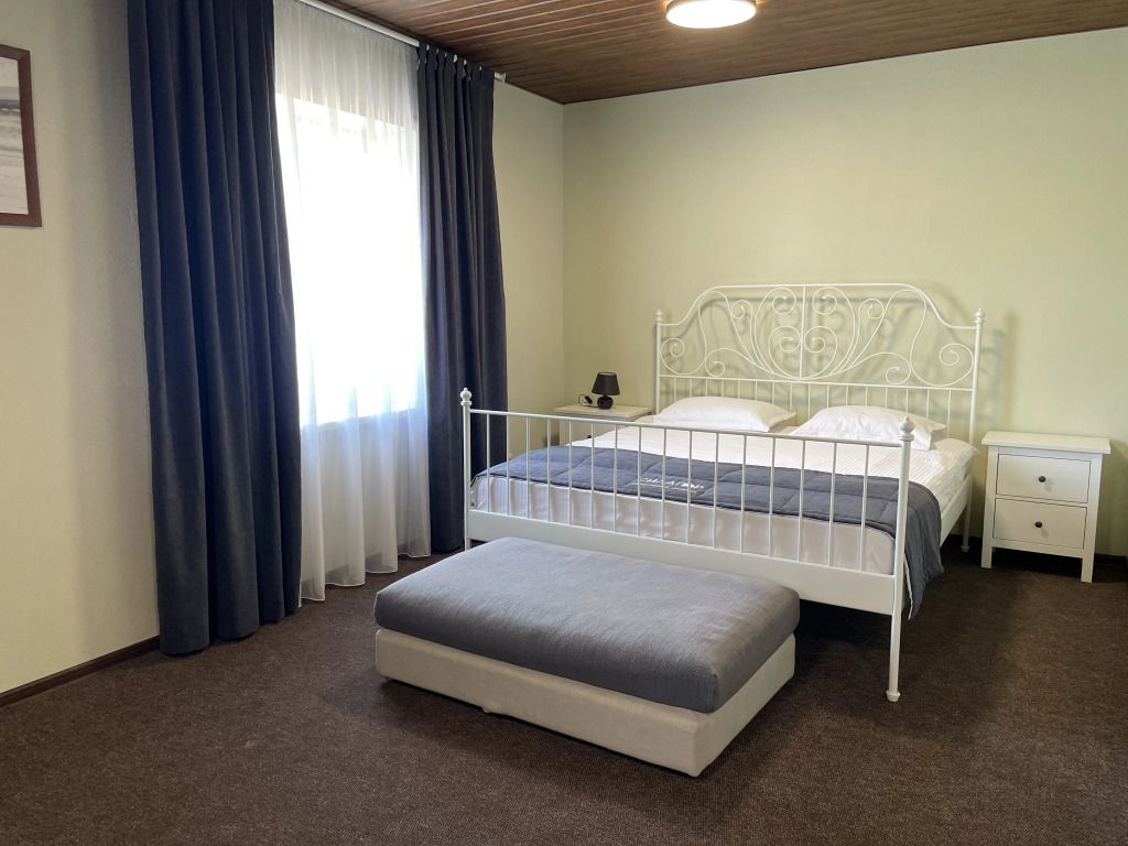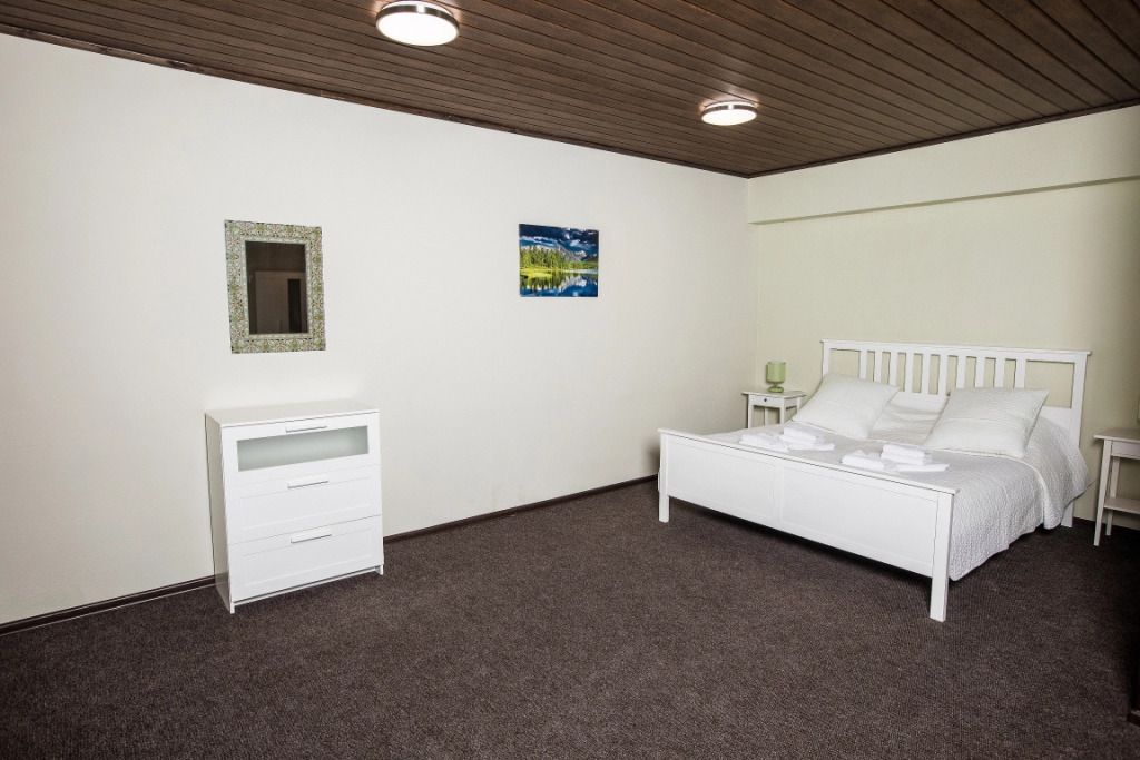 Просторный номер-студия площадью 46 м2 на четырех человек. Большая туалетная комната с душем. Большая двуспальная кровать, диван с журнальным столиком, раскладушка, телевизор.