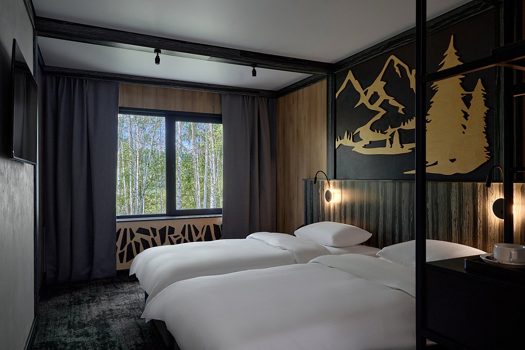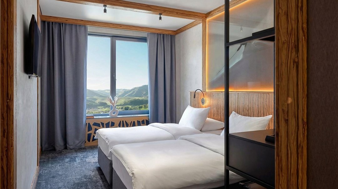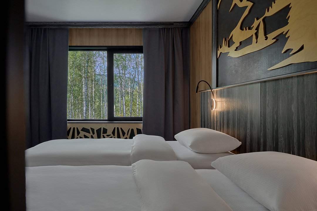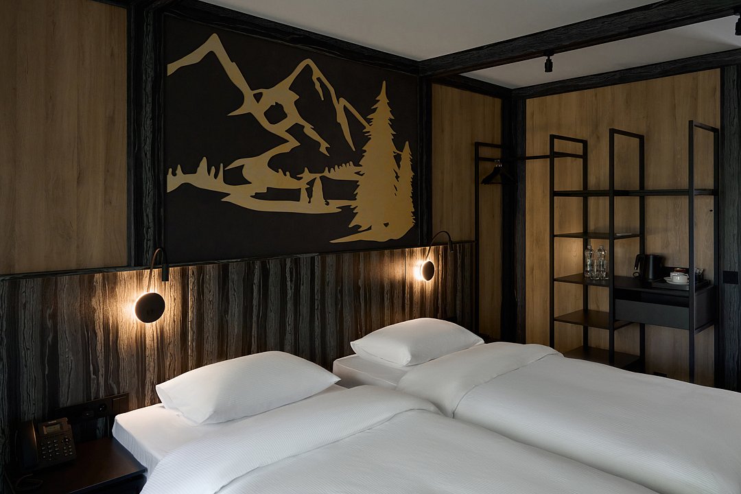 Просторный номер площадью 23 м² оборудован двумя односпальными кроватями и современными удобствами. Возможно объединение со смежным номером категории Дабл. Из окна открывается прекрасный вид на горы.