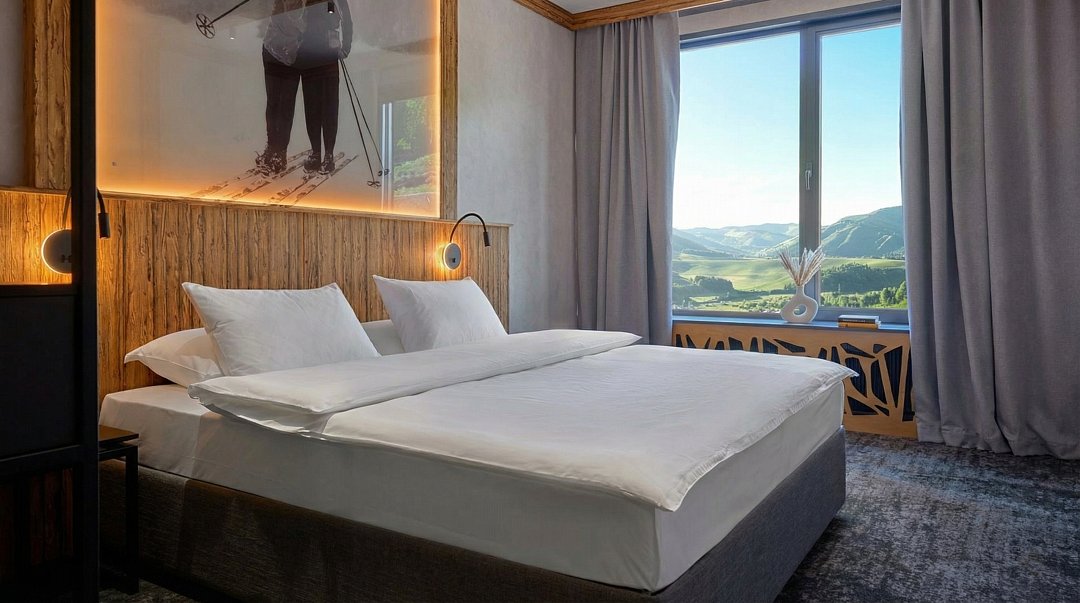 Из окна открывается прекрасный вид на горы. Идеальный выбор для тех, кто ценит простоту и функциональность. Просторный номер площадью 23 м², большая двуспальная кровать обеспечит вам спокойный сон и приятное пробуждение.