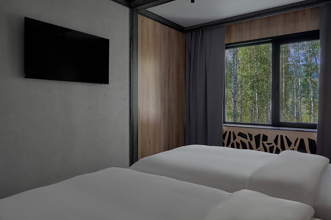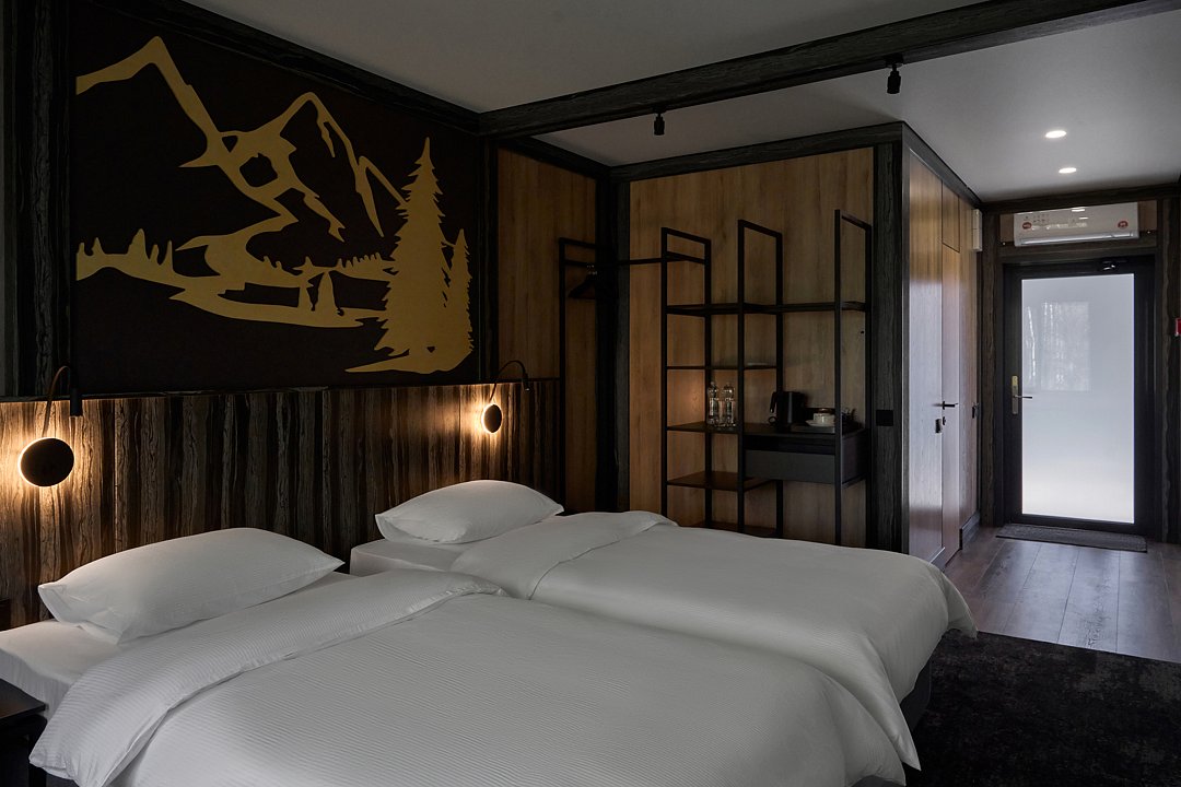 Современные номера в модульном отеле с отдельным входом. В номере две односпальные кровати, телевизор, чайник, собственный санузел с душевой. Выбирайте свободу передвижения и бюджетное размещение для активного отдыха в живописных горах!
