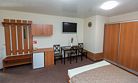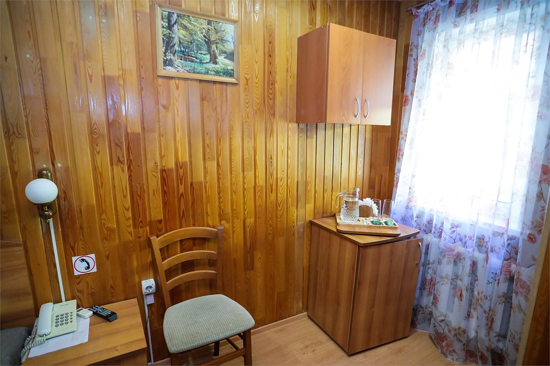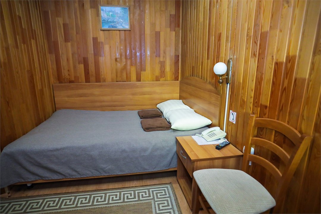Однокомнатный номер площадью 11 кв.м. В номере: двухспальная кровать, шкаф, столик, телевизор, холодильник, телефон, кондиционер, набор посуды, эл.чайник Ванная комната: WC, раковина, душ. Внутренняя отделка номера - натуральное дерево.Услуги и удобства