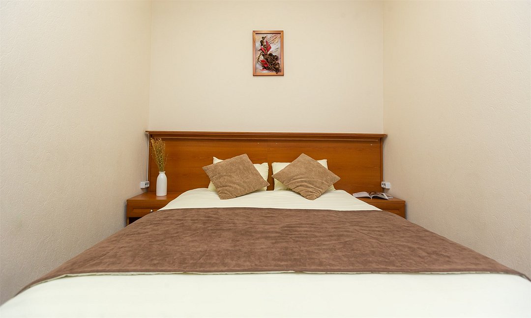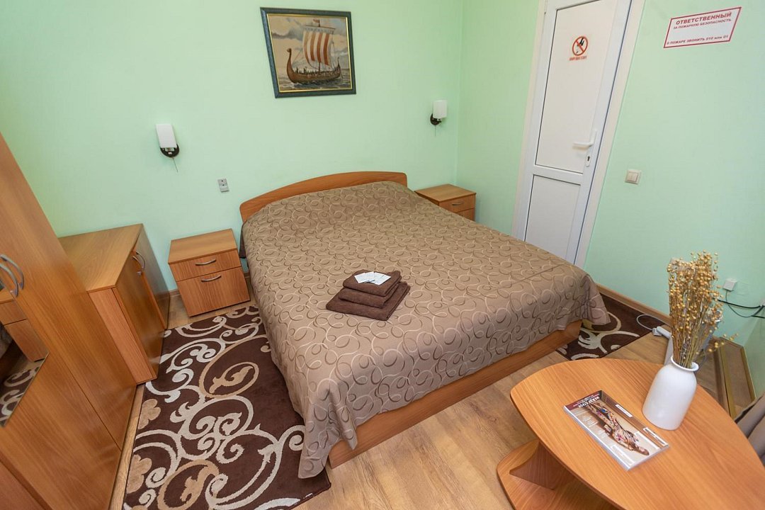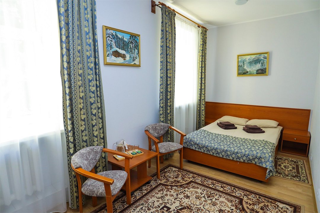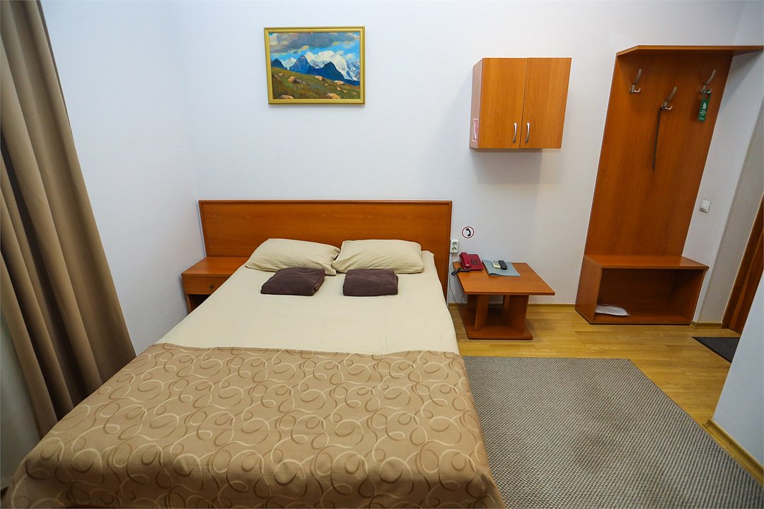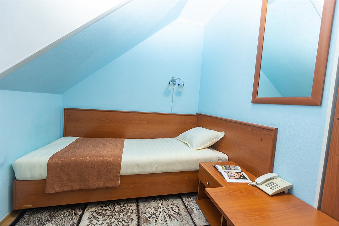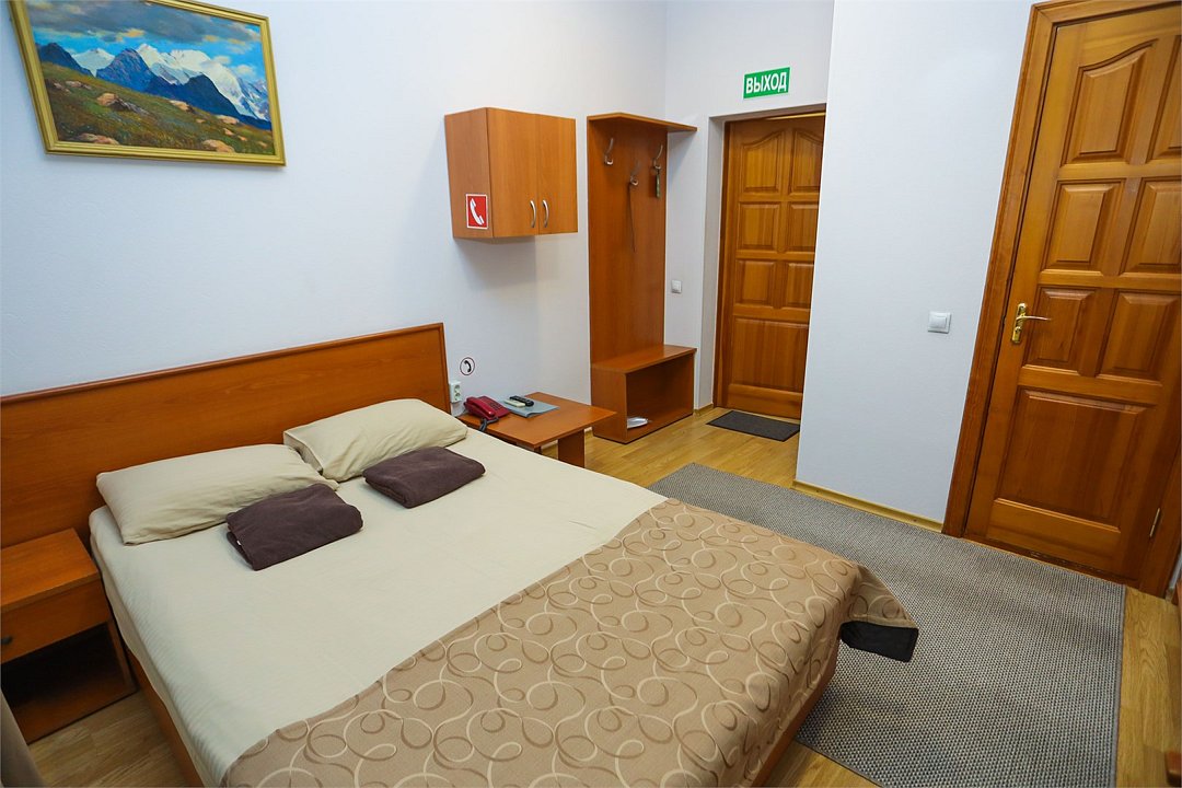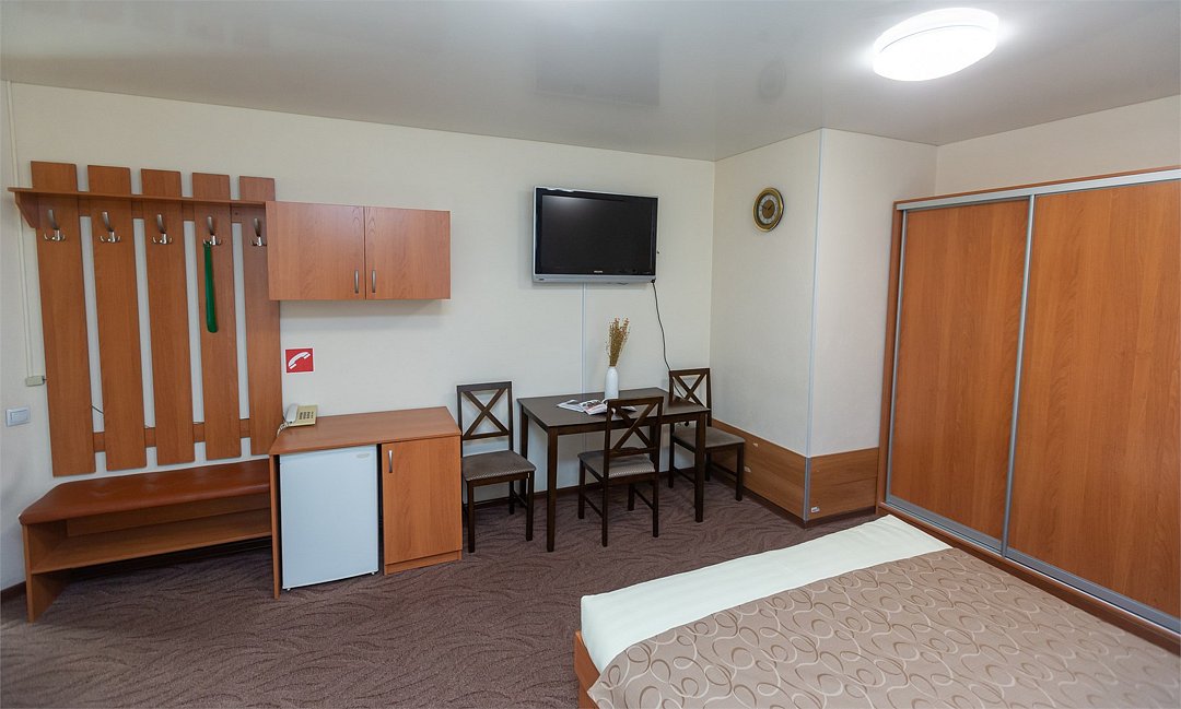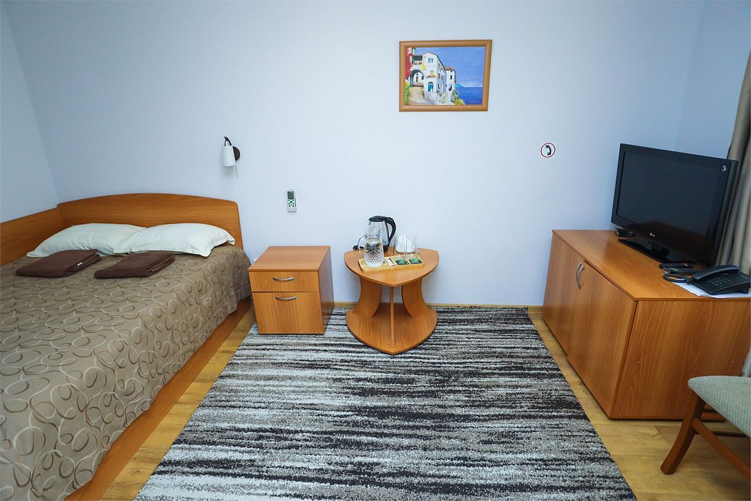 Однокомнатный номер площадью 20 кв. м. В номере: 1 двуспальная кровать, дополнительное место (еврораскладушка), шкаф, столик, телевизор, холодильник, телефон, кондиционер, электрочайник, чайная пара. Ванная комната: WC, раковина, душевая кабина.Услуги и удобства