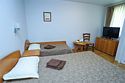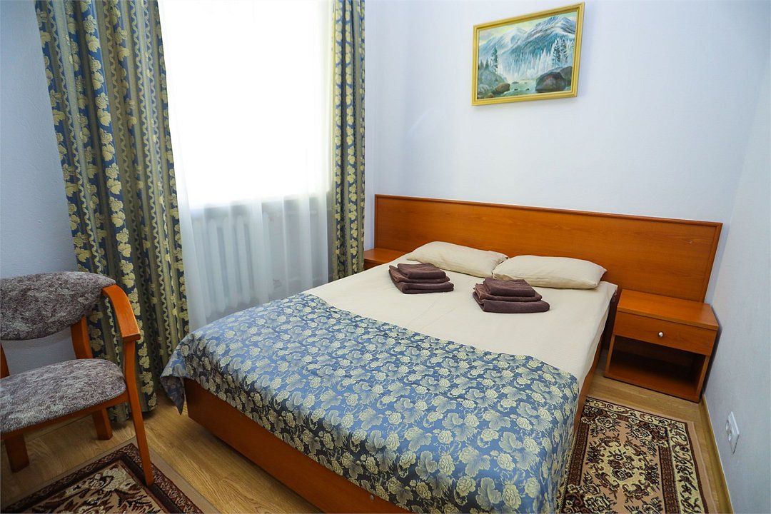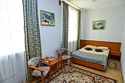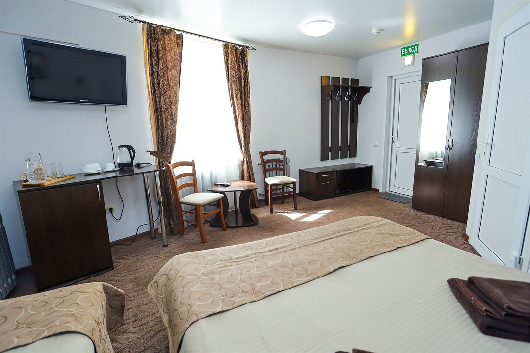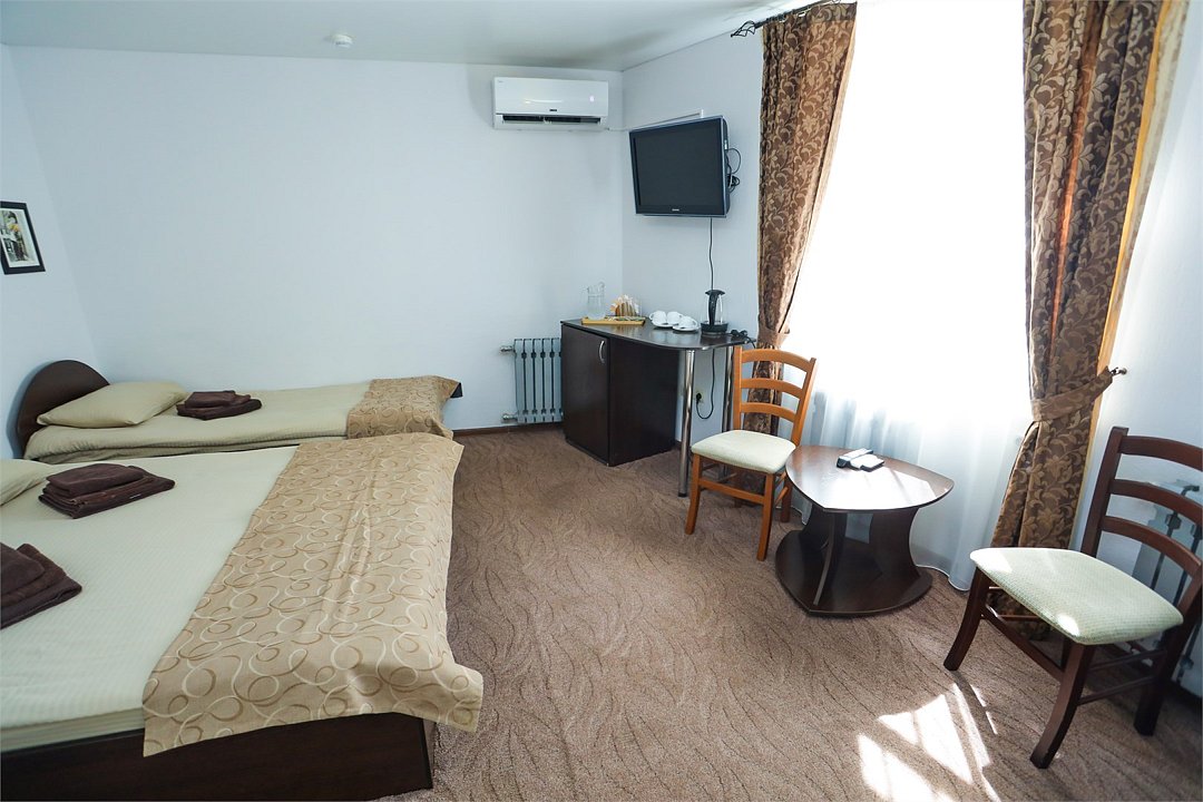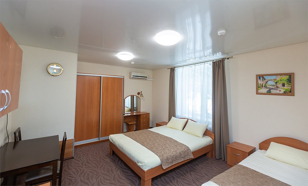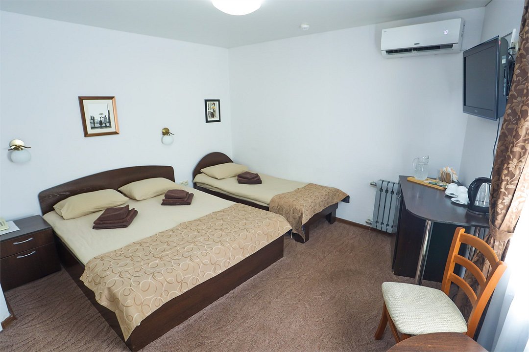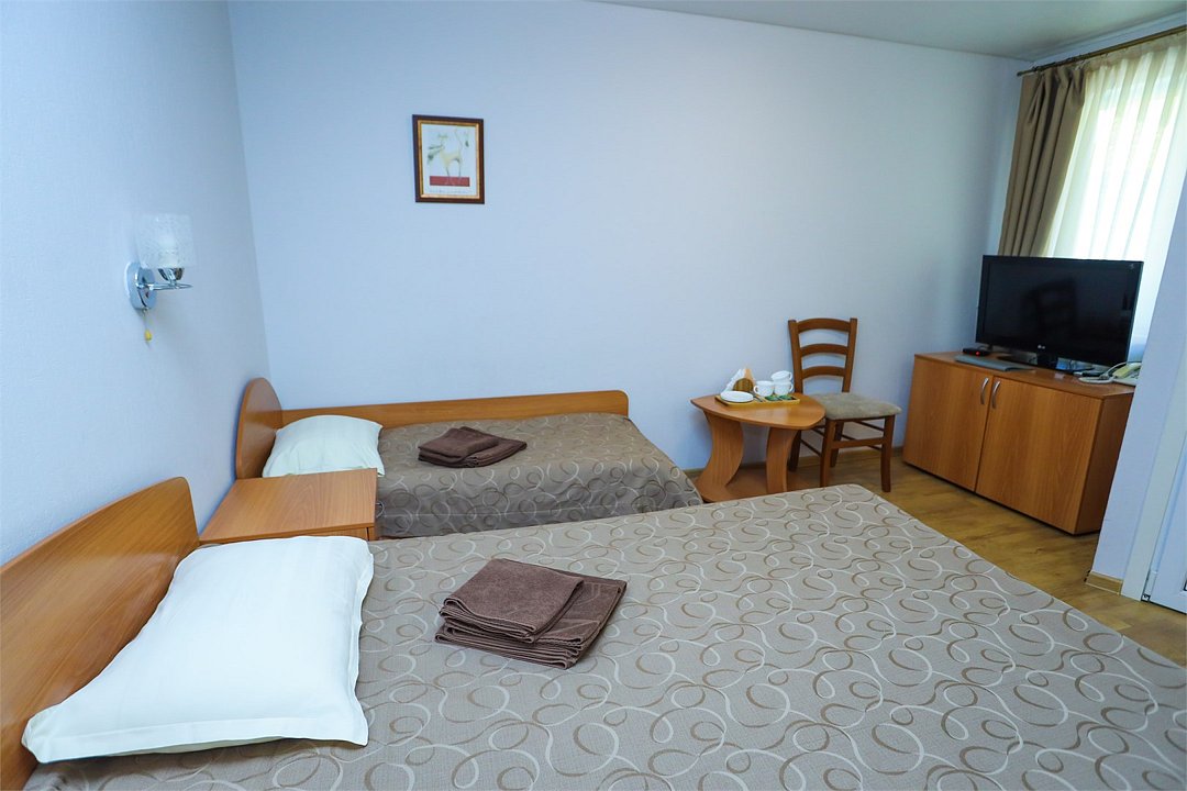 Однокомнатный номер площадью 20 кв. м. В номере: 1 двуспальная и 1 односпальная кровать, 1 дополнительное место (еврораскладушка), шкаф, стол, телевизор, холодильник, телефон, кондиционер, электрочайник, чайная пара. Ванная комната: WC, раковина, душевая кабина.Услуги и удобства
