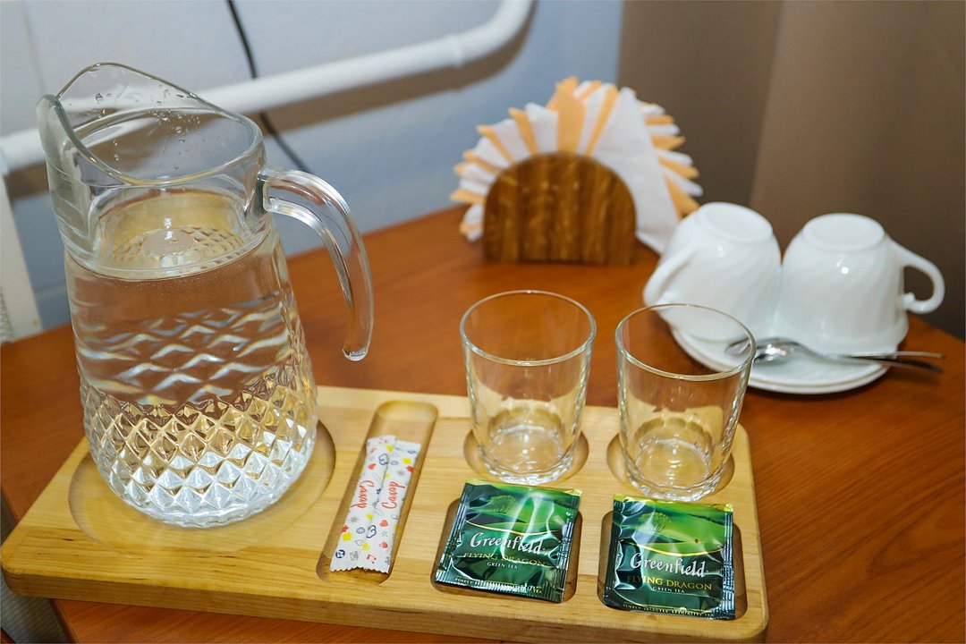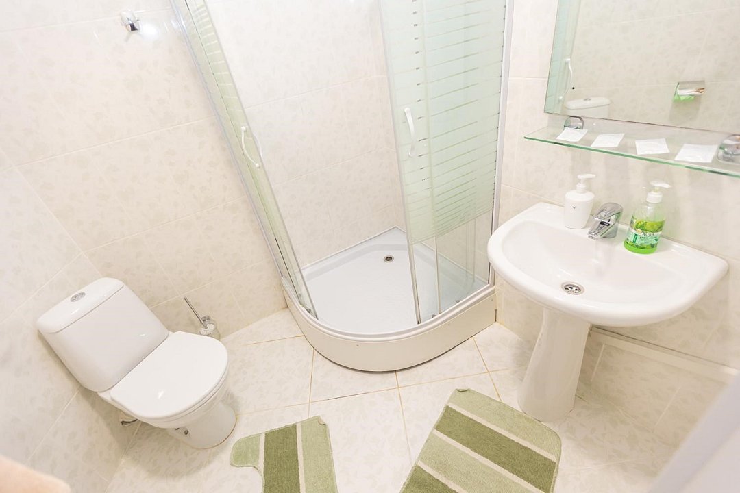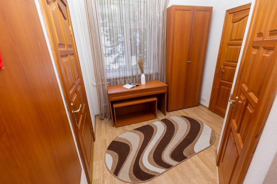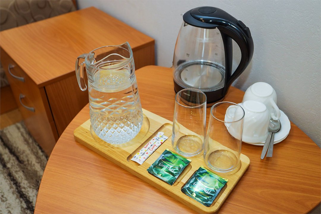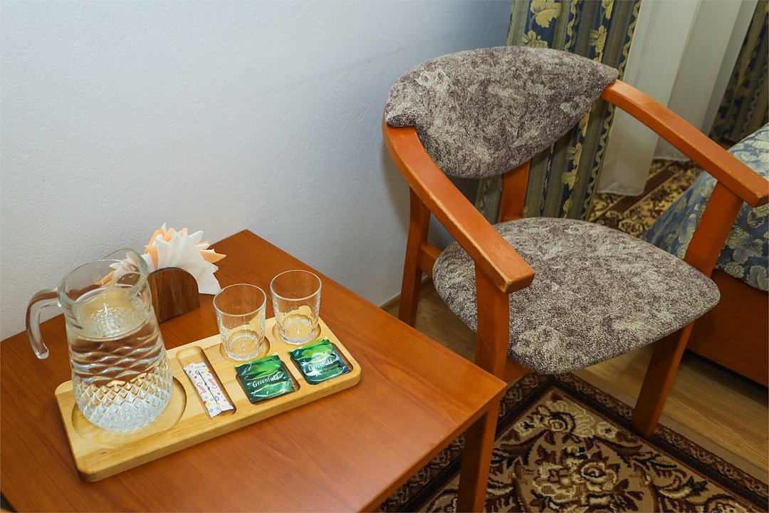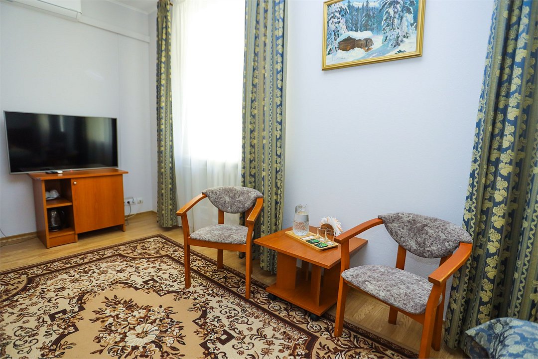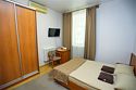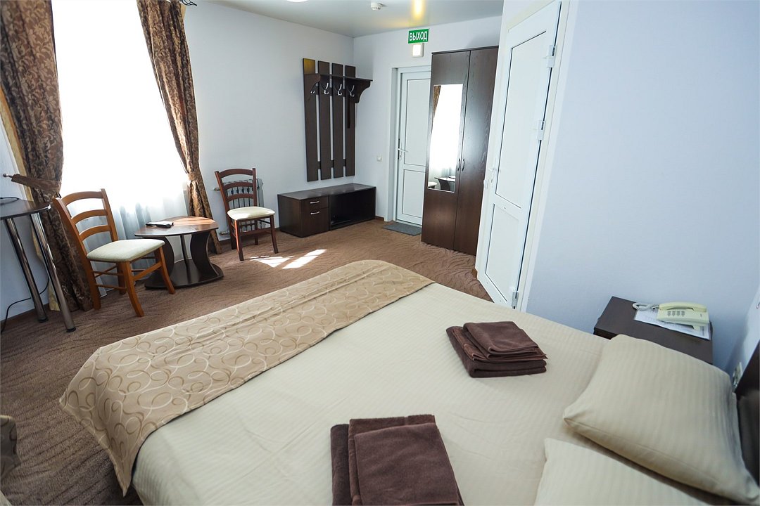 Однокомнатный номер площадью 20 кв. м. В номере: 1 двуспальная и 1 односпальная кровать, 1 дополнительное место (еврораскладушка), шкаф, стол, телевизор, холодильник, телефон, кондиционер, электрочайник, чайная пара. Ванная комната: WC, раковина, душевая кабина.Услуги и удобства