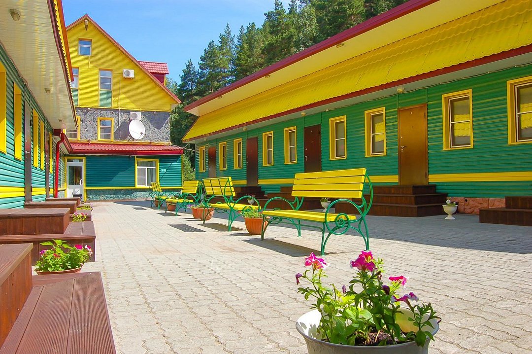 Пансионат представляет собой 2 здания: основной корпус 3-х этажный, не оснащенный лифтом и дополнительный этаж Cabana с отдельными входами в номера. Расположение в форме круга образует уютный внутренний дворик, где можно насладиться цветами и отдохнуть на скамейках. Номерной фонд представлен 26 номерами, 12 из которых расположены в основном корпусе, 14 номеров - в Cabana. Каждый номер оснащен санузлом с душем кондиционером, холодильником, телевизором, чайником и феном. Питание в пансионате реализуется по системе "меню-заказ" в ресторане на 1 этаже. Завтрак уже включен в стоимость проживания. Также имеется VIP-зал, где можно провести фуршет. Благодаря удобному расположению пансионата, его гостям доступны все развлечения курорта. Лечение в виде курсовки (без проживания) можно также приобрести в любом санатории. Ближайший к пансионату санаторий – «Алтайский замок».