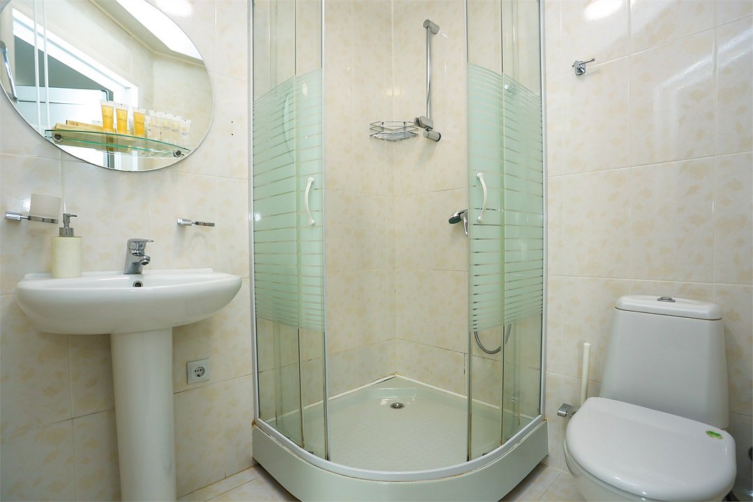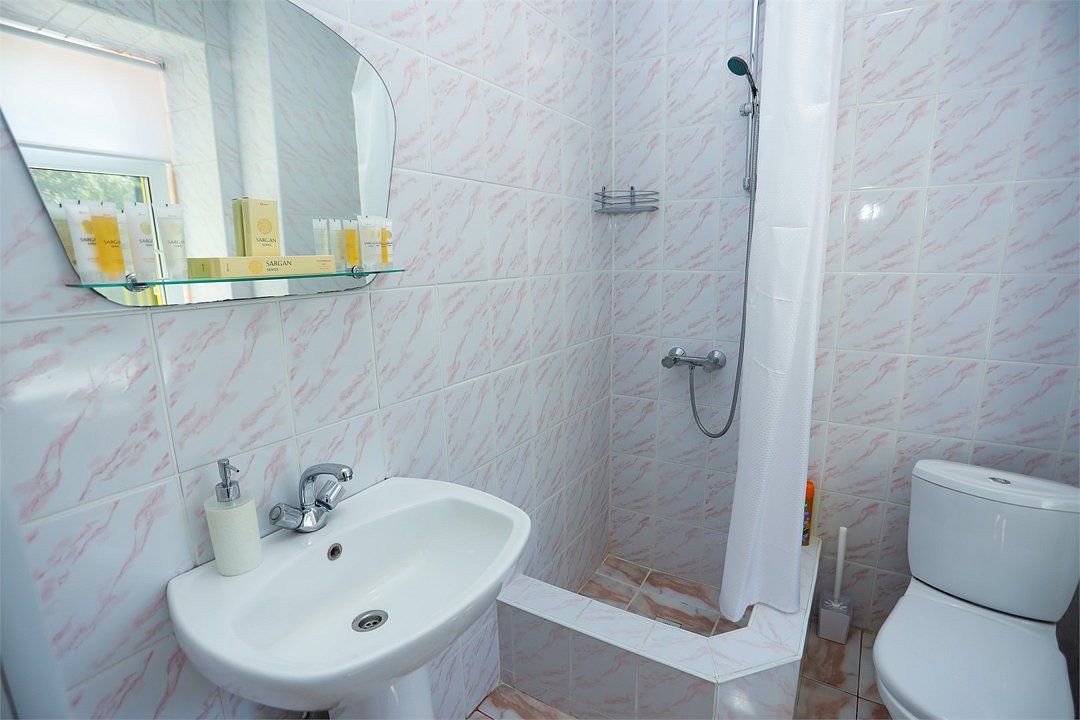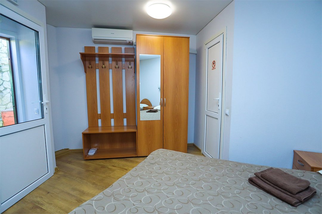 Однокомнатный номер площадью 15 кв.м. В номере: 1 двуспальная кровать и 1 кровать для ребенка (до 10 лет), шкаф, столик, телевизор, холодильник, телефон, кондиционер, электрочайник, чайная пара. Ванная комната: WC, раковина, душевая кабина.Услуги и удобства