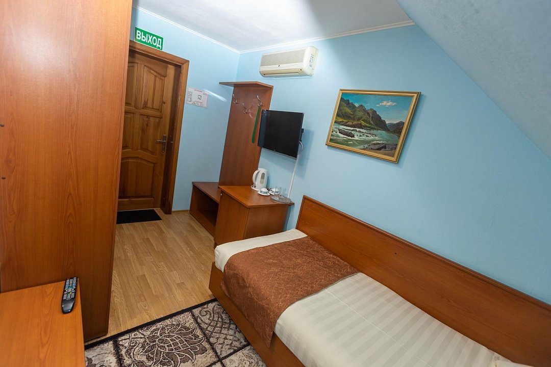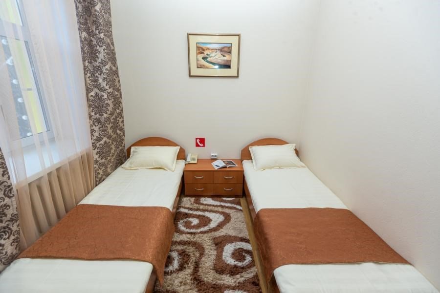 Однокомнатный номер площадью 12 кв. м. В номере: 2 раздельные кровати, шкаф, столик, телевизор, телефон, холодильник, кондиционер, электрочайник, чайная пара. Ванная комната: WC, раковина, душ.Услуги и удобства